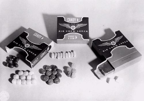 Tres envases de la fuerza aérea Las fuerzas armadas norteamericanas produjeron raciones según el ámbito en el cual debían moverse los soldados por lo que fueron diseñadas raciones para la jungla, montaña, primeros auxilios, hospitales y las denominadas 5 en 1 y 10 en 1. La ración destinada a la jungla fue desarrollada apresuradamente sin tener una idea cabal de las necesidades en ese medio y estaba compuesta de carne en conserva, leche deshidratada, cacahuetes, galletas, cereal precocido, goma de mascar, cigarrillos, caramelos duros, cacao en polvo, café soluble, limón deshidratado, pasas, sal, azúcar y papel higiénico. Para misiones en alta montaña y regiones frías las raciones eran de alto contenido calórico, de lenta digestión y fácilmente transportables. Los alimentos que constituían esta ración de montaña eran una pasta untable sustituta de la mantequilla, café soluble, leche en polvo, galletas, caramelos, tres variedades de cereales comprimidos, queso deshidratado, una barra de ración D, una barra de frutas y cereales, goma de mascar, zumo de limón en polvo, sopa deshidratada, sal, azúcar, te, cigarrillos, fósforos, papel higiénico. Se complementaba con el menú 1 compuesto de carne y habas deshidratas, el menú 2 con carne –siempre enlatada – y patatas deshidratadas y el menú 3 compuesto de salchichas y arroz precocido. Todas estas raciones eran embaladas en cajas sólidas de cartón de fibra (el mismo material que se empleaba antiguamente para hacer maletas) con la descripción de su contenido en el exterior. Pero así como se confeccionó un menú para alta montaña, también se lo hizo para la fuerza aérea cuyas necesidades básicas se resumían en cuatro puntos: 1: Para un solo piloto como en el caso de los Vought F4U Corsair o el Curtiss P-40. 2: Para casos de emergencia (abandono de la máquina) 3: Para aviones militares de pasajeros en los cuales se podía calentar rudimentariamente una comida. 4: Para casos de aterrizaje forzoso, botes salvavidas y supervivencia. Además de estas raciones también se emplearon las ya conocidas C y K para situaciones de rescate. Era habitual que los bombarderos tuvieran consigo un expendedor de doble boca para caramelos, goma de mascar y otras golosinas de fácil apertura y al alcance de la mano que constituía el almuerzo de la tripulación.