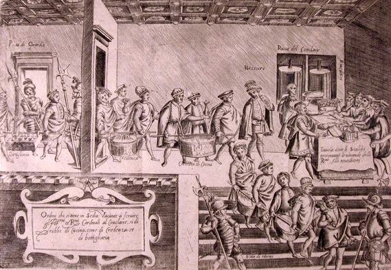 Sería inútil desbrozar el libro ‘Fait de cuisine’ si previamente no montamos los decorados, a modo de teatro, que nos faciliten reconocer los simbolismos y permitan hacernos accesibles los entramados políticos y sociales de la época, que por cierto fueron el germen de la cocina que conocemos hoy, eso sí, con la complicación de mostrar todo el poder del estado en ceremonias donde la religión, católica en este caso, y la estratificación social tenían una importancia que hoy nos puede parecer extraña y donde, también, ciertos componentes alimenticios, sobre todo las especias, mostraban la singularidad y el refinamiento de la corte en cuestión. Entre los siglos XIV y XVI se produce el gran cambio en la concepción del poder en Europa, se pasa de mostrar al poderoso señor como el más fuerte y más temerario para trocar su imagen en la del hombre de estado, con grandes capacidades administrativas y diplomáticas y que por traslación era la que mostraba en la mesa y en los grandes acontecimientos públicos. Ya no se presenta el noble, ante su pueblo o ante sus vecinos, como un gran tragaldabas, por el contrario ahora es alguien que se cuida en la palabra, es un hábil organizador de eventos, moderado en sus gestos, cuidadoso en extremo no sólo en la alimentación, sino también en todo lo que le compaña como si fuera un rito, de ahí la elegancia en la mesa, la presentación de los platos, la riqueza en la vajilla y la mantelería, la música que acompaña a las comidas y los espectáculos. Es cierto que ya un siglo antes había preocupación en las buenas maneras en la mesa, algo que se convirtió en ‘casi’ un género literario, siendo el máximo exponente en Italia las cincuenta cortesías en la mesa escritas por fraile laico Bonvesin de la Riva, el cual dice que la mesa debe de ser un lugar de serenidad y conversaciones agradables, donde se habla poco y si se hace no se debe de molestar a los otros comensales para no faltar al principio de hospitalidad. Indica las posturas a tener en la mesa: no se debe de apoyar sobre ella, no se debe acercar demasiado la cara al plato, no hacer ruidos mientras se come, no meterse los dedos en la boca para limpiarse los dientes; no comer mucho, pero tampoco demasiado poco; no llenar mucho los platos; no emborracharse; no beber de prisa antes de haber tragado el bocado que se está masticando; no hurgar en la mesa; no poner demasiado pan en las sopas o en las salsas; no estornudar o toser de modo ordinario. Como podemos comprobar algo básico en la vida de hoy pero que en aquellos tiempos había que enseñar como etiqueta a los guarros comensales que se sentaban en las mesas de los señores, que por cierto tampoco eran un derroche de buenas costumbres. Independientemente a los comensales, la cocina se procuraba de elementos exóticos y caros como signos de lujo y ostentación, como ejemplo está el uso de las especias, haciendo especial hincapié en productos como el ‘momun melegueta’, que es una especie picante que provenía de las costas del golfo de Guinea o el jengibre blanco, por el contrario la pimienta, muy común entonces, era escasa en los banquetes. De igual forma las especias eran utilizadas también por su función terapéutica, ya que durante todo el medioevo la relación entre la farmacología y la dietética eran muy fuertes, incluso se puede decir que esta costumbre llegó hasta el siglo XVII. Los médicos insistían en utilizar las especias como condimentos adecuados para volver más digeribles los alimentos, siempre bajo la premisa de los cuatro humores: lo caliente, lo frío, lo húmedo y lo seco, de modo que, por ejemplo, la pimienta era propicia para equilibrar la frialdad y la humedad de los alimentos como el pescado o las verduras. La presentación de los platos, como un signo aristocrático, se hacían con decoraciones de colores semejantes a los esmaltes o los metales que aparecían en heráldica y para ello usaban colorantes naturales entre los que se encontraban las hojas y yerbas para el verde; canela para los marrones, azafrán para el dorado y amarillo; uvas, pasas, ciruelas, higadillos de pollo o pan muy tostado para el negro; moras para el celeste; henna para el rojo. Toda esta parafernalia, esta ostentación y este rito sólo estaba al alcance de muy pocos, un microcosmo de personas que mantenían, como ya he indicado, una jerarquía estricta en forma piramidal mientras el pueblo, osea casi todos, comían como podían y cuando podían por lo que sólo debe de tenerse este estudio como válido en el sentido de saber como disfrutaban los poderosos.