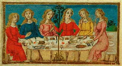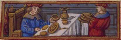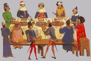 En primer lugar debemos colocar a los figurantes de este banquete en los lugares adecuados de nuestro escenario imaginario: en un rincón los músicos, los bufones y los bailarines; una gran chimenea encendida si hace frío, en el centro una gran mesa con forma de U y con los invitados sentados en el lado externo, donde nosotros también lo haremos; todos colocados en orden jerárquico, más al centro más importante, en los extremos los menos; en el centro, en una posición más alta, para dominar todo, el duque. La mesa casi vacía, sólo la mantelería y cucharas que más parecen indicar el lugar de cada comensal, rebanadas de pan y platos de oro o plata, los cuchillos son portados por cada uno de los invitados traídos desde sus casas, es la costumbre, no hay tenedores porque todavía no se habían inventado, ver mi artículo dedicado al tenedor. Es importante lavarse las manos al menos dos veces durante la comida, una antes de empezar y otra a la mitad de esta. Comienza la función, por la otra esquina del escenario aparecen los camareros con grandes bandejas de comida, el servicio es el llamado a la francesa, un conjunto de comidas servidas a la vez. Cada comensal escoge la cantidad y alimento que más le gusta, siendo servidos en primer lugar los de mayor rango social, de forma que hay una selección automática con los alimentos donde los últimos solamente poden degustar lo que ha sido dejado por otros en las fuentes, así que a nosotros casi no nos llega casi nada, no somos nobles y nos han colocado en el extremo de la mesa. Es hora de describir los servicios y los platos que nos ofrecen y para ello que mejor que los servidos en 1403 por el maître Chiquart en honor del duque de Borgoña y ofrecido por Amadeo VIII. Se ofrecen dos servicios con seis platos cada uno, formados por dos menús servidos a la vez, el primero de carne y el segundo de pescado, 24 platos en total: 12 de carne y 12 de pescados. PRIMER SERVICIO: