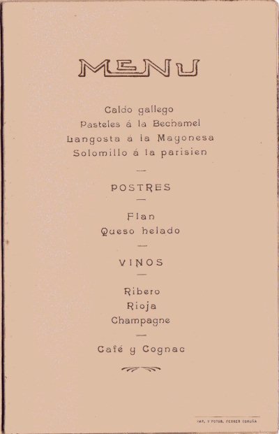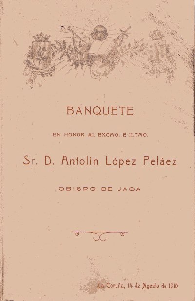 3.2.- El obispo de Jaca que llegó en tren y no en jaca. Desde el día 10 de agosto de este año de 1910 la prensa local –y sobre todo La Voz de Galicia- dedica un espacio, que irá “in crescendo”, a la visita del obispo y al desarrollo de los actos que culminarán con el banquete motivo de este estudio. La primera noticia que hace referencia a su llegada se produce en este mismo día 10 en un lugar no excesivamente destacado del periódico pero con más despliegue informativo que otras noticias, como por ejemplo la estancia en Vigo del ferrolano Pablo Iglesias, fundador del PSOE y de la UGT española. En esta competencia por la cobertura mediática –que durará un par de días- Pablo Iglesias pierde claramente ante López Peláez, sobran los paralelismos. Esta primera información dos días antes de su llegada es, sobre todo, un llamamiento a la población para que se sume al homenaje que organiza la Real Academia Galega, informando que a los actos ya se han unido académicos y personalidades de las cuatro provincias gallegas, haciendo hincapié en que las invitaciones para el banquete se podían recoger desde el día siguiente en la Academia Gallega. En la noticia del día 12 se informa sobre los protocolos previstos a su llegada pero también se insiste en el banquete que se le ofrecerá, del que futuriza que estará “concurridísimo”, y donde tienen asegurada su asistencia “la flor y nata” de la intelectualidad gallega, por lo que se intuye que todavía no tendrían vendidas todas las plazas, ya que ahora se ofrece hasta la dirección donde se pueden pagar y retirar las invitaciones: en la Real Academia Gallega, en la calle Riego de Agua, 38. Llega pues López Peláez a Coruña el 12 de agosto en el tren correo. Viene acompañado desde Madrid por su mayordomo, Emiliano Alonso y por el comandante de Ingenieros señor Azpiazu. En Monforte se les suman el académico y también sacerdote Marcelo Macías, que en poco mas de 15 años será nombrado hijo adoptivo de Galicia nada mas y nada menos que… ¡por las cuatro diputaciones! En Betanzos lo recibe una comisión de la Academia formada por el presidente Manuel Murguía al que acompañaban los siguientes académicos: Francisco Tettamancy, escritor e historiador; Martínez Salazar, editor de la Biblioteca Gallega y director del Archivo Histórico de Galicia; Federico Maciñeira, arqueólogo y uno de los fundadores de la Academia y el director del Eco de Galicia señor Gómez Martínez. Ya en la estación lo esperaba una representación del clero, frailes, escritores, académicos y otras distinguidas personalidades así como una delegación de la colonia maragata en Coruña compuesta por Domingo Nieto y Claudio San Martín. Durante su estancia en la ciudad el obispo se hospedará en la calle Zapatería, en casa de su también ilustre paisano Andrés Martínez Salazar. El día 13 visita la torre de Hércules, el llamado el Faro del Fin del Mundo, interesándose en la antigüedad del monumento y admirando el inmenso y hermoso panorama que el faro descubre. Se queda en Coruña hasta el día 15, lunes, en que se traslada a las Torres de Meirás a pasar dos días con Emilia Pardo Bazán y su hija. Allí oficiará una misa de agradecimiento por el regreso del hijo de Emilia, Jaime, sano y salvo de la campaña de Melilla en la llamada Guerra de África. Pero no sólo hay misa en Meirás, hay también un gran festejo. En lo alto de la torre ondea la bandera roja y amarilla con el escudo nobiliario de la señorial familia en el centro. Misa pontifical con numeroso clero que ayuda al obispo y con música dirigida por Javier Ozores. Jaime Quiroga luce el hábito de Caballero de Santiago y el Coronel Cavalcanti el uniforme de los Húsares de Pavía con la laureada de San Fernando en el pecho. Impresionante. A continuación de la misa se ofreció en el amplio salón de la planta baja del castillo un esplendido “lunch” en el que hacen los honores las mujeres de la familia Pardo Bazán. Después de la comida hubo paseo, baile, charlas y cotilleos y algunas fotos de recuerdo. El día 18 se marchará a Albares, en León, donde veranea y donde podrá entonar aquello de: “Que descansada vida la del que huye del mundanal ruido y sigue la escondida senda por donde han ido los pocos sabios que en mundo han sido”. 3.3.-Unos maragatos buenos y generosos Es la Real Academia la que ofrece este homenaje a Antolín López Peláez, obispo de Jaca. El banquete, al que asistieron 80 personas, se celebra en el comedor del hotel Ideal Room a la una del mediodía del día 14. La mesa presidencial estaba ocupada por el obispo, en el centro como es lógico ya que era el obsequiado, a su derecha los señores Folla Yordi, alcalde de la ciudad, José María Ozores, presidente de la Diputación de A Coruña y el tesorero de la Academia y catedrático José Ballesteros; a su izquierda Manuel Murguía, Marcelo Macías y el general López Morillo. El resto se fue situando conforme llegaban, sin ninguna orden de protocolo establecido, de manera que los mejores lugares fueron tomados al asalto. Entre los comensales –abundantes en número y calidad- se encontraban las autoridades locales, escritores, artistas, periodistas y todos los académicos residentes en la ciudad; había también una nutrida representación de la colonia maragata que ofreció el champaña, todavía no era cava, y los cigarros. Precisamente al descorchar el champaña comenzaron los discursos que continuarán a lo largo de la jornada. Unas breves palabras de López Morillo abren el acto para que López Peláez tome la palabra pronunciando un discurso tripartito: primero de agradecimiento por los obsequios recibidos, después de loas a Galicia y por último sobre la buena y mala prensa. Se acuerda en este banquete pedir a José Canalejas, presidente del Consejo de Ministros, y a Julio Burrell, ministro de Bellas Artes, la concesión de la laureada de Alfonso XII para el insigne prelado. P