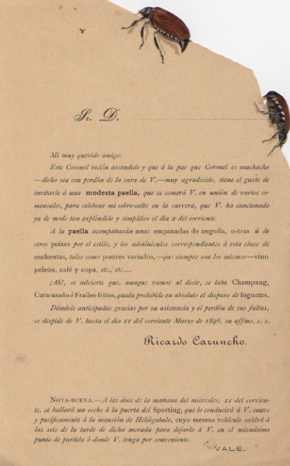 2.4.- Una comida de camaradería Si nos atenemos fielmente a la misiva de esta comida, observamos que cumple una doble función, es una invitación pero también muestra un menú escrito para un grupo muy determinado de amigos: compañeros de la milicia a los que agradece su ascenso a coronel; salto que obligatoriamente tiene que hacerse tras un curso especial que capacita al militar para tal cargo y que debe ser sancionado por sus superiores. La tarjeta especifica el día exacto en que fue ascendido al puesto en el que permaneció hasta su muerte, pues el ascenso a general es elección exclusiva del gobierno, a no ser que concurran méritos de guerra. La invitación está impresa en un papel satinado de 18x12 cm.; pulcra, sin decoración ni colores excepto dos cucarachas de color marrón troqueladas y estampadas en la parte superior y que subrayan el tono festivo del convite. Centrándonos en el menú encontramos como plato fuerte uno que a finales del siglo XIX era ‘casi’ una novedad: la hoy famosa paella. Tiene un nacimiento impreciso, sobre el siglo XVIII aproximadamente, como alimento de los hombres del campo en el reino de Valencia, y nombrada en sus principios como arroz a la valenciana, posteriormente toma el nombre del recipiente en que se cocina, paella, con que se le conoce hoy en día. Por el lugar donde se toma, A Coruña, posiblemente fuese el “bareyo” asturiano, que no es otra cosa que una paella marinera hecha con arroz, almejas, calamares, mejillones, gambas, langostinos, guisantes, salsa de tomate, azafrán, ajo, perejil, aceite y sal. Un aprovechamiento de todo tipo de animales marinos en un guiso hecho en una cazuela metálica o de barro. El segundo plato es, bajo nuestro punto de vista, el más representativo de la cocina gallega, la magnífica y suculenta empanada, ya conocida en el siglo XII como se puede apreciar en las esculturas del palacio de Xelmírez en Santiago. El origen de este plato es el de poder transportar alimentos elaborados –de una forma limpia y con un aceptable grado de conservación- a las labores campestres o a los viajes, ejemplo que siguieron los reyes de España en sus días de caza o paseos por los campos de La Granja de San Ildefonso, El Escorial o en otros lugares. Sobre los postres no se aclara de qué tipo son, por lo que puede interpretarse que sería fruta de temporada. El vino es el de la tierra, para los brindis el inevitable champaña y en los postres, después del café, licores entre los que se encontraría el curaçao, que no es otra cosa que un licor hecho con aguardiente, monda de naranja y azúcar. Como vemos, una comida gallega, sin rebuscamientos, sencilla y familiar, como corresponde al espíritu castrense. El lugar de la cita fue el por aquel entonces muy moderno y famoso Sporting Club, fundado en 1890, pero desconocemos donde se celebró la comida, ya que “la mansión de Heliogábalo” a la que se refiere es más bien una metáfora.