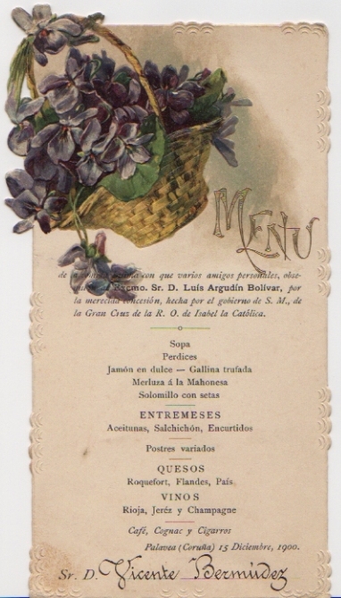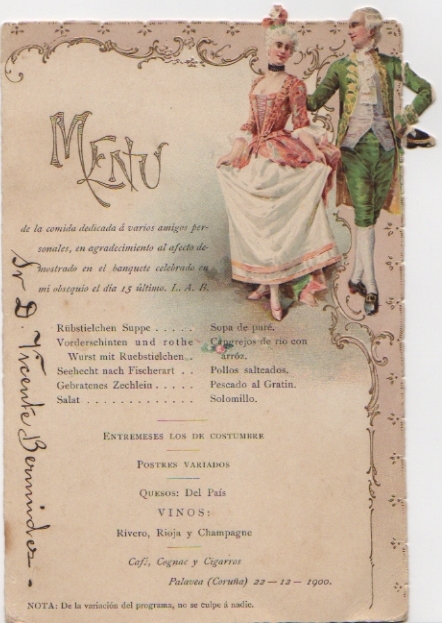 3.3.- Otro banquete para los amigos, en agradecimiento Este segundo banquete consecuencia del agradecimiento que tenía Luis Argudín Bolívar por el anterior ofrecido tan sólo una semana antes, termina con estas comilonas seguramente por la prudencia de estos nuevos invitados, que no siguen la tónica de invitaciones y contra invitaciones hasta el infinito. La invitación de este banquete tiene una factura semejante al anterior: 16x11 cm., a color, estampada y troquelada, y la misma tipografía en el cartel con el nombre de menú. La decoración consiste en una pareja con vestimenta afrancesada situada en el ángulo superior izquierdo, que es de donde arranca una orla decorativa. Todo parece indicar que fueron impresas en el mismo lugar. La rareza de este menú es que está escrito en alemán, algo sin explicación aparente a no ser que estuviera invitado algún marino tripulante del barco alemán atracado en este momento en el puerto de A Coruña. La composición del menú sigue la misma tónica que el anterior, aunque algo más parco en contenidos. En cuanto a la sopa de puré es difícil saber su composición ya que pudo ser de patatas, de guisantes o de cualquier otro ingrediente, incluido el tomate, que en aquel momento acababa de ser descubierto. El segundo plato de cangrejos de río con arroz sería un plato de lujo -hoy sigue siéndolo por la escasez de los cangrejos, que están casi extinguidos- al ser animales muy carnosos y sabrosos, de modo que tuvo que ser una delicia. El tercer plato, pollo salteado, era también una finura porque los pollos de antes en nada se parecían a los de ahora y su sabor era exquisito. El hecho de ser salteado supone que sólo se utilizarían las partes más tiernas del ave y hechas en golpe de sartén fuerte. Posiblemente, después de salteado, se le añadiría un poco de salsa y se le daría un ligero hervor para homogeneizar los sabores (para saber más se debe leer el cuarto plato del menú celebrado con ocasión de los Juegos Florales de Tui en 1891). El pescado al gratín, cuarto del menú, es aquel que una vez guisado, asado, frito, a la parrilla, etc., se gratinaba. Los gratinados, a diferencia de los glaseados, se hacen con elementos sólidos, por lo que se tuvieron que emplear elementos tipo provenzal (pan rallado, ajo, perejil, etc., junto con un poco aceite de oliva), “veloutes” (similar a la bechamel sólo que sustituye la leche por un caldo, el que le da el nombre). Al hablar de los entremeses, la costumbre nos hace pensar en el anterior menú con aceitunas, conservas en vinagre y salchichón. En los quesos observamos que desaparecieron los de Roquefort y el ahora ya conocido de Flandes y sólo quedan los del país. Con este menú nos despedimos del siglo XIX para adelantarnos cada vez más en los gustos y costumbres gastronómicas de nuestros días.