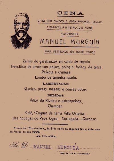 2.2.- 1909. Primer banquete en una Galicia en fiestas. Pasear por Galicia en esta centuria es festejar la Exposición Regional Gallega que se celebró en Santiago de Compostela. Fue, la Exposición, una muestra artística, cultural e industrial que creó muchas expectativas sobre todo por la imagen del país que se proyectaba en el exterior. Y al igual que hoy en los grandes acontecimientos se hace un conteo de los días que faltan para la fecha tan señalada, los medios informativos de la época en Galicia, desde meses antes, insertaban un recordatorio del día de la inauguración. Todavía había otro motivo de excitación, la visita el día 25 del rey Alfonso XIII a la Exposición. La presencia real que, sobre todo en aquellos tiempos, daba categoría a cualquier celebración y provocaba el entusiasmo de la gente. El magno evento reúne más de 600 instalaciones, reunidas en once pabellones. Su catálogo es inmenso: diez mil piezas de arqueología, obras de arte e históricas llegadas de todo el mundo: Alemania, Cuba, Portugal…, y de todas las provincias españolas. Algunas novedades llaman poderosamente la atención como el laberinto –de autoría japonesa-, o el hipódromo con concurso hípico incluido, las magníficas escaleras de mármol del palacio central de la exposición y un cinematógrafo, todo un adelanto en ese momento. No solo muestra la exposición planos, mapas, cuadros, maquetas, fotografías, grabados y libros también la cultura más ligera tiene su espacio pues se contrataron, para el pabellón de teatro, las actuaciones de: Los Corbetta con su cantante, la bella Claudia, conocida como “la voz de oro”; Isabelita Muñoz la reina de la jota; el imitador Follier; Saldac instrumentista; el prestidigitador Florences y otros afamados artistas. Entre las muchas medallas que se concedieron en la Exposición hay que destacar una –por estar este trabajo dedicado básicamente a la gastronomía- que es la concedida a los melindres, dulce gallego por excelencia, una especie de rosquilla hecha con harina de trigo, yemas de huevo, manteca de vaca, jarabe de azúcar y glaseadas. Brilla Santiago este año con la Exposición pero hay todavía otro motivo de fiesta: es también el primer Año Santo del siglo, del que nos quedará como recuerdo las medallas que se acuñaron para tal fin. Para los que estén interesados hay que decir que las medallas eran de aluminio y de un tamaño de 4 cm. En el anverso se reproduce al Apóstol con el báculo de progreso en una mano y en la otra un libro y una orla donde se lee ”Deus Hispania S. Jacobe. Ora pro nobis”. En el reverso, el sepulcro con la estrella y el texto ”Año Santo de 1909”. 2.3.- Una cena nada provinciana en el restaurante La Provinciana con amigos y admiradores en una larga noche de conversaciones, cariño y abrazos. Este primer banquete que comentamos es un homenaje celebrado en la fonda La Provinciana, el lunes 2 de marzo de 1909, y fue ofrecido por “amigos y admiradores”. La fonda todavía existe y esta situada en la calle Castelar hoy renombrada como Rúa Nova en el centro mismo de la ciudad. Estuvieron presentes el Marqués de San Martín, el Abad de la Colegiata, López Soler, Pita, Martínez Salazar, Tettamancy, Lugrís, Álvarez Ínsua, Ponte y Blanco, MARCHESI Buhigas, J. García, Mon, Camino, Barreiro Costoya, Pérez Linares, Álvarez Díaz, Aguía, Fáginas, Vaamonde, Panisse, Mariñas, Badía, Carré, Tejada, Seijo, Castillo, Martínez Morás, Tafu, Ulloa García Fernández, Cortés, Villanueva, Rodríguez González, Carnota, Sanz y Barreiro. Como dice la Voz de Galicia, un amigable grupo de entusiasta devotos. Pero todavía hay más porque manifiestan su adhesión y disculpan su asistencia Marcelo Macías, Fernández Alonso, Lenzano Requejo, Rodríguez López, Vega Blanco, García Rivera, Díaz, Salvador Golpe, Salgado y Barbeito. Murguía presidía la mesa. Hubo brindis y discursos: Tettamancy ensalza a Murguía, Lugrís expresa la adhesión del Centro Gallego de La Habana, Álvarez Ínsua pide una patria nueva y fuerte, Castillo habla en nombre de la juventud, Sanz pide la unión de los gallegos, Bernárdez reclama jefes para conducir a un pueblo valeroso, Carnota y Martínez Salazar resumen en un abrazo su admiración y fidelidad a Murguía, Barreiro Costoya propone enviar flores a las hijas del homenajeado y así transcurre la noche hablando de Rosalía, de Curros… hasta que –como en las bodas que de una sale otra- llegan al acuerdo de otra comida íntima a celebrar el próximo domingo, esta vez en homenaje a Martínez Salazar. Acaba pues el acto y los comensales, cansados y con una nueva cita en sus agendas acompañan al patriarca a su casa. La invitación lleva en el ángulo superior izquierdo el busto de Manuel Murguía de frente firmado por C. Vilas. La tarjeta es sencilla, indica el menú motivo y lugar de la celebración y por toda decoración presenta el antedicho retrato. 2.4.- Cena de frutos de la tierra como muy bien dice la tarjeta. Comienza la copiosa cena con un rico caldo para abrir boca. Es lo más típico del país y aunque aquí le llamen zumo de garbanzo con repollo no es más que un caldo gallego. El caldo se puede hacer de repollo, de grelos, de nabizas y de berzas, todos exquisitos aunque cada uno tiene sus defensores. La receta es muy sencilla: se pone el agua en una tartera, las habas –que se espantan un par de veces si no se dejaron en remojo- un hueso, unto y sal y se deja cocer hasta que las habas estén casi hechas, se le añade entonces las patatas y la verdura cortadas en trocitos y se deja cocer otros 15 minutos. Ahora habría que decir “y servir” pero lo cierto es que el caldo está mas rico de un día para otro y para otro… A continuación, un revuelto de arroz con pescado, pollo y frutos de la tierra que es lo que hoy llamaríamos paella mixta. La paella es el plato más conocido de la rica y variada cocina española. El origen de la paella no está