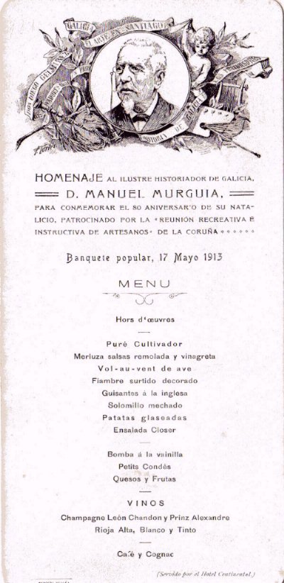 2.5.- 1913. Cuatro años más tarde otro tierno y generoso homenaje a Murguía, esta vez por su cumpleaños. Pasados cuatro años del homenaje anterior, el 17 de mayo de 1913, se le hace en A Coruña otra gran fiesta con motivo de su 80 cumpleaños. Ya mayor el Patriarca – vivirá todavía 10 años más- le acompaña no sólo la ruina física propia de la edad si no también, y como siempre, la económica, unas dificultades monetarias manifiestas que se vislumbran en los discursos, regalos y deseos que se le ofrecen en está comida. El escenario para este afectuoso acto es el salón de fiestas de la Reunión de Artesanos que se decora expresamente para este momento con un lienzo, obra del artista levantino Enrique Saborit, que alude al amor de Murguía por Galicia. El menú fue servido por el Hotel Continental, el catering del momento. La entrada de Murguía al salón, escoltado por dos mujeres: Filomena Dato y María Barbeito, es apoteósica ya que los 200 comensales lo reciben con una entusiasta salva de aplausos. Es en la sobremesa cuando se inician los brindis y discursos. Comienzan con un panegírico de Casás que ensalza al homenajeado en todas y cada una de sus facetas, al final de su discurso recuerda la pensión que Francia otorga al historiador, político y poeta Alphonse de Lamartine solicitando el mismo reconocimiento de Galicia para Manuel Murguía. A continuación Filomena Dato lee unos versos en gallego que ella misma compuso para la ocasión y que son aplaudidos por el público, después el representante de la Escuela de Artes y Oficios de Vigo, señor Requejo, comienza un discurso de variada temática en que en primer lugar – y no podía ser de otra forma- loa vehementemente a Murguía pasando después a pedir la unión de los gallegos y a reprobar a las clases dirigentes que desertan de los puestos de honor. Con algo de memoria vemos que aunó los discursos pronunciados por Sanz y Bernárdez en el homenaje anterior a Murguía. Pero todavía no terminó Requejo, pues en este discurso exige a los organismos oficiales que cumplan la deuda que moralmente Galicia tiene contraída con el historiador. Le sucede Mirambell que lee unas cuartillas patrióticas y se hace eco de la idea de Dávila de obsequiar a Murguía con una casa, casa que llevaría el Nombre de Rosalía. A continuación Domingo Ares lee una extensa poesía que compuso expresamente para esta ocasión. Bien sabemos que obras son amores y no buenas razones y otra vez serán los emigrantes los que darán una lección de generosidad: el Centro Gallego de Buenos Aires comunica –mediante un telegrama que lee Manuel Casás- una asignación mensual vitalicia que será entregada por el Banco Pastor y que hace que la sala estalle en un enorme aplauso. Recuerda Eugenio Carré, con algo de celos quizá ante la magnanimidad porteña, que el Centro Gallego de La Habana siempre había contribuido a propulsar la obra del historiador y como demostración Lugrís Freire comunica que es depositario de 2.500 pesetas para la edición del quinto tomo de la Historia de Galicia. Grandes aplausos y agradecimientos a este centro que siempre sustentó materialmente las iniciativas gallegas. Luego, los representantes de Valencia, Cataluña y Castilla fueron dibujando sus apoyos, interrumpidos por Fraiz Andón que en un hermoso discurso sobre Murguía termina diciendo: “el héroe ya está aquí: ya se halla sobre el pedestal glorioso de su obra ¡Alzadlo!. Toma la palabra Lugrís para leer el discurso escrito por Murguía en el que agradece las muestras de estima y aprecio, que consiente en recibir solo si es en nombre de todos los que lucharon y sufrieron por Galicia. Una gran ovación pone fin al discurso y comienza el desfile. En una carroza Murguía y Casás acompañan –como caballeros que son- a Filomena Dato a su casa y después seguidos a pie por un gran numero de admiradores, se dirigen a San Agustín donde el escritor tiene su domicilio. Allí es aplaudido y aclamado como final de tan bonita fiesta. Al día siguiente y como continuación de los festejos de cumpleaños habrá una velada literaria en el Circo de Artesanos, pero ese acto excede la finalidad de este artículo. La invitación, austera y en blanco y negro está presidida por un grabado realizado por F. Cortés y la imprimió Ferrer. En el centro, un busto de Manuel Murguía enmarcado en un circulo, a la derecha un ángel que sostiene la cinta que lleva escritos los títulos de sus obras junto al laurel, símbolo de inmortalidad. Así mismo una gaita representando a Galicia y una lira y la paleta de pintor como símbolo de las artes. El banquete comenzó con entremeses o como se escribe en la carta del menú hors d’oeuvres, que quedaba mas fino y le da empaque al ágape. A continuación un puré al que llaman “cultivador”, lo que querrá decir –atendiendo a la etimología de la palabra- que sería de patatas y verduras, un pobre comienzo para un banquete que prometía hartazgo. El primer plato que se sirve, después de estos engaña estómagos, es una merluza con salsa vinagreta y salsa remolada. Es tan fácil de hacer que solo se necesita cocer el pescado y hacer las salsas, la vinagreta lleva una parte de vinagre por tres de aceite, sal y pimienta y la remolada es una mayonesa con alcaparras, pepinillos, perejil, perifollo, estragón y cebollitas. Es de suponer que se servirían en salseras para que cada comensal tomase la que más le gustase. Y ahora parece que vamos hacia atrás pues de segundo tenemos volován de ave y fiambres, que más parecen componentes de un aperitivo que de un plato en medio de la comida. El volován de ave es un hojaldre relleno. Ciertamente, el de las pluma sería gallina, pollo no podría ser por el precio que entonces alcanzaba y ya otro tipo de aves voladoras tendrían el precio por las nubes, nunca mejor dicho y aprovechando el chiste fácil. La preparación consistiría en deshuesar el ave y cortar en pedacitos la carn