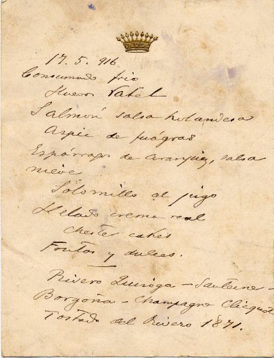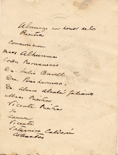 Aunque los invitados pertenecen al círculo mas próximo de la escritora es posible que, con la disculpa de agasajar a los Riestra, la finalidad de esta reunión sea el agradecimiento por los favores prestados en su designación como catedrática, ya que Julio Burell era, en aquel momento, ministro de Instrucción Pública y medió junto con el Conde de Romanones, a la sazón Presidente del Consejo de Ministros, para la obtención de la cátedra. A este almuerzo le sigue, el 23 de mayo, otro en la casa del conde de Romanones donde coinciden de nuevo las familias Riestra, Pardo Bazán y Romanones que esta vez son los anfitriones. Repiten en este almuerzo las familias pero también los platos servidos, pues al menos dos de ellos ya los había ofrecido la Condesa en su recepción. Pero no adelantaremos detalles de esta reunión que estudiaremos mas adelante. BIBLIOGRAFÍA: Acosta, E. (2007): Emilia Pardo Bazán. La luz en la batalla. Biografía, Barcelona, Lumen.