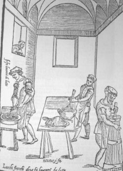 Como hemos comentado en la parte primera, el maestro Leonardo nos sorprende con su vida dedicada a la cocina, sus pinturas eran casi una obligación que le era impuesta por la corte y los que hacía eran casi a desgana la mayoría de las veces, por lo que estamos conociendo de él sabemos que le gustaba vivir intensamente sus fantasías y encontraba más satisfacción creando y estudiando que componiendo. Nos sorprende que su pintura sólo fuera para el un trampolín que le lanzaba a otras situaciones que le eran más gratificantes, sobre todo después de haber visto su Monalisa ya media decena de veces en el museo del Louvre y haber sentido un escalofrío que me recorría la espalda sólo con observarla cada vez. Pues siguiendo con la gran afición a la cocina de éste hombre que le duró hasta su muerte contaremos algunas anécdotas que de seguro harán las delicias de nuestros lectores, que por cierto cada día son más, lo cual agradecemos y que nos hace sentirnos útiles. En sus escritos encontramos cosas tan peregrinas como la forma de sentar a un asesino a la mesa, la forma de comportarse, el poder medicinal de los alimentos, las cualidades que debe de tener un buen repostero, las sopas de sobre o un sin fin de anotaciones, alguna de las cuales transcribiremos aquí, como por ejemplo algo que nos hizo gracia por la forma como nos lo presenta, nos referimos a la elaboración del pastel del pastor y que escribe lo siguiente: Tomas a tres pastores, limpiadlos cuidadosamente, luego hacedlos entrar en las cocinas para que elijan aquellas hierbas que sus ovejas comen en mayor medida entre sus pastos. Machacad estas hierbas muy bien para hacer una pasta con aceite que extenderéis toda ella la oveja, con suma generosidad, y y esta oveja la cocinaréis cubierta de una costra de polenta dentro de las puertas de vuestro horno. Este plato es así llamado porque, gracias a los excelentes pastores, lo que está dentro de la oveja está asimismo fuera de ella, y de esta forma no entran en pugna los sabores. |