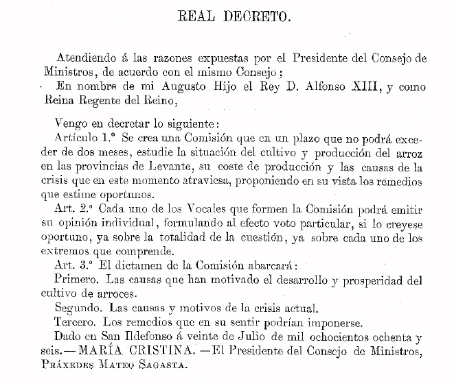 El ambiente se hacía irrespirable con visos de rebelión popular que casi se lleva a efecto, ya que tras la reunión de La Liga de Propietarios de Valencia el 8 de junio, se celebró otra en Alcira el 18 de julio, esta ya tumultuosa, donde llegó a decirse: "Esperemos, que cuando las Comisiones que están gestionando se desengañen, entonces llevaremos a efecto otras determinaciones que todos sabemos". En esta reunión se exigió la dimisión de todas las Corporaciones municipales; solicitar un impuesto transitorio y subida de aranceles para los arroces extranjeros básicamente. Las conclusiones que sacaron los comisionados de la crisis arrocera fueron las que a continuación se exponen como final de esta primera parte y que se transcribe en su totalidad: Resumiendo todo lo expuesto en este escrito, resulta: 1.° Que el cultivo del arroz en España es un cultivo prohibido, y sólo autorizado en los terrenos pantanosos que no son susceptibles de producir otras plantas. 2.° Que el arancel de Aduanas ha señalado siempre y sostiene aún hoy, un derecho altamente protector para el arroz. 3.° Que la combinación de estos dos sistemas administrativos hace que la producción del arroz sea de hecho una industria tan privilegiada, que no existe otra en España en parecidas ni análogas condiciones. 4.° Que el cultivo del arroz ocupa una superficie de unas 500.000 hanegadas, 41.600 hectáreas y que esta superficie es superior en unas 150.000 hanegadas 12.500 hectáreas á la amillarada, con y sin pago de contribución. 5.° Que los gastos del cultivo del arroz pueden apreciarse en el reino de Valencia en 312 reales la hanegada, 936 pesetas la hectárea, incluyendo en este coste el pago de la renta de la tierra y el interés del capital. 6.° Que el producto de una hanegada puede estimarse en 3 cahíces, ó sean 72 hectolitros por hectárea, cuyo costo de producción es de 20 pesetas los 100 kilogramos, que por término medio se ha vendido de 1880 á 1884, á 27, dando un beneficio real de 35 por 100 del capital empleado. 7." Que la producción normal del arroz puede estimarse como mínimo en un millón de cahíces de arroz en cáscara, que producen unos 100 millones de kilogramos de arroz de todas clases, incluso el partido. 8.° Que la producción del comercio del arroz no ha aumentado en España en grandes proporciones en los últimos veinte años, y que la totalidad del que se produce se consume directamente en la alimentación. 9.° Que la importación del arroz limpio extranjero ha sido casi nula hasta 1876, y desde aquel año poco importante y muy anómala. 10. Que no se introduce en España el arroz extranjero con cáscara, ni el simplemente descascarado que los valencianos llaman esquellat.11. Que el consumo del arroz, muy considerable en Valencia, es poco importante en las provincias del litoral mediterráneo, exiguo en las del Centro y casi nulo en las del Norte. 12. Que la prosperidad del cultivo del arroz ha dimanado: a) De la naturaleza de las tierras á él dedicadas y de las condiciones en que el cultivo se realiza. b) Del desarrollo de las comunicaciones, tanto terrestres como marítimas, y c) De que dispone del mercado peninsular, que ha consumido siempre el arroz que se ha producido en España y puede consumir cantidades muy superiores á la producción actual. 13. Que en 1884 y 1885 se ha producido una crisis en la región arrocera de Valencia por efecto del escaso rendimiento de las cosechas, debido á accidentes climatológicos y á la epidemia colérica de aquellos años. 14. Que han contribuido á hacer más dura y persistente esta crisis: a) La excesiva protección arancelaria que, impidiendo la importación de los arroces extranjeros, ha elevado anormalmente el precio y la renta de las tierras. b) La falta de previsión y de ahorro de los cultivadores, que ha ocasionado la carencia de capitales y la necesidad de adquirirlos á intereses usurarios, y el empleo de abonos no apropiados al cultivo y de semillas agotadas. c) La desigualdad en el costo de la producción, debido á que gran parte de las tierras dedicadas al cultivo del arroz no satisfacen la contribución territorial por este concepto, y á que se destinan á este cultivo tierras no acotadas con arreglo á la legislación vigente, y d) A la baja general del precio del trigo y otros cereales y legumbres que sustituyen al arroz en la alimentación. 15. Que la importación del arroz extranjero no ha influido en la crisis, porque se ha importado poco y en cantidades anormales. 16. Que los precios y condiciones á que se ofrece el arroz extranjero, tanto en Europa como en Asia, no han influido ni pueden influir en los precios del arroz valenciano. 17. Que la calidad excelente del arroz nacional y el gusto de los consumidores españoles le aseguran la primacía en el mercado nacional. 18. Que siendo la crisis efecto de accidentes fortuitos, desaparecerán sus efectos sin adoptar medidas para conjurarla. 19. Que el interés general del país exige que no se conceda un impuesto adicional ó transitorio sobre el arroz extranjero, ni está justificada la necesidad de esta imposición. 20. Que la Real orden de 25 de Mayo de 1885, que dispuso que 'los arroces de países no convenidos, descascarados en países convenidos se considerarán como producto de estos, está ajustada á justicia y no debe derogarse. 21. Que hay motivos para presentar á las Cortes un proyecto de ley otorgando el perdón de la contribución por un año á los cultivadores de arroz que perdieron las cosechas de 1884 y 1885. 22. Que deben rectificarse los amillaramientos de las tierras arrozales y las cartillas evaluatorias con arreglo á las cuales esta producción tributa. 23. Que conviene al interés general revisar la legislación vigente relativa al cultivo del arroz y declararlo libre en toda España, y 24. Que conviene estimular esta producción adoptando las medidas que la mayoría de la Comisión, de acuerdo en este punto con la minoría, p