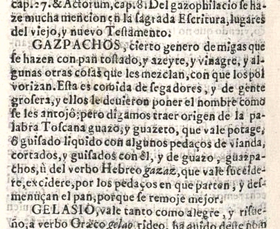 Interesante resulta saber que en este diccionario de Covarruvias ni aparece la palabra tomate y del pimiento hace una descripción muy alejada de la que tenemos hoy, ya que las variedades que hoy conocemos son manipulaciones genéticas modernas, siendo los primeros, los traídos de América, rojos, pequeños y picantes, de ahí su nombre por su parecido el sabor a la pimienta, lo que hoy llamamos guindillas, (aconsejo leer mi trabajo sobre la historia del pimiento) La temeridad de muchos a la hora de encontrar el origen del nombre de esta sopa siempre me dejó bastante perplejo, los hay que dicen que viene de la palabra caspa o de otros de lugares que ni imaginar puedo, como de Portugal, porque, como en todo, hay cada 'investigador' que tira de espaldas, seres temerarios que tendrán muchas carencias culturales pero lo que es miedo al ridículo nunca. Antes de abordar una tarea lingüística siempre es más cómodo acudir, en primer lugar, al Diccionario de la Real Academia de la Lengua Española, es simple, sólo conectarse a su web y escribir la palabra que deseamos saber su significado y origen, algo que muchos ignoran, así que si buscamos el nombre gazpacho lo encontramos con la siguiente definición: "(Quizá del árabe hispánico *gazpáčo, y este del griego γαζοφυλάκιον, cepillo de la iglesia, por alusión a la diversidad de su contenido, ya que en él se depositaban como limosna monedas, mendrugos y otros objetos).1. m. Género de sopa fría que se hace regularmente con pedazos de pan y con aceite, vinagre, sal, ajo, cebolla y otros aditamentos". Un siglo y medio más tarde el repostero real, de los reyes Felipe V y Fernando VI, Juan de la Mata, en su libro editado en 1786, 'Arte de repostería', da la fórmula de un gazpacho hecho para las mesas nobles, no ya el de gentes groseras del que hablaba Covarrubias, y donde comprobamos que en nada se parece al gazpacho tal y como hoy lo tomamos y que nos da su receta: "El gazpacho más común es el llamado 'Capón de galera', que se hace así: Se tomarán las cortezas de una libreta de pan, sin el meollo o miga, y tostadas, se mojarán en agua: después se echarán en su salsa, compuestas de espinas de anchoas, y un par de ajos, bien molido uno y otro, con su vinagre, azúcar, sal y aceite, todo bien mezclado, dejando ablandar el pan en el ajo: después se pondrán en el plato, agregándoles todos o parte de los ingredientes y legumbre de la Ensalada Real. Otro modo menos costoso es hacer el ajo sólo con un poco de limón picado, su agrio, y azúcar, guarneciendo el gazpacho como el antecedente". Sólo nos queda saber que componentes formaban parte de la llamada Ensalada Real y volvemos a llevarnos otra sorpresa porque nada más lejos de lo que hoy llamaríamos un gazpacho, ya nos da la siguiente fórmula: "Picada la escarola y lechuga, mezcladas con camuesas mondadas, un poco de hierbabuena, cebollas y apio, así mismo todo picado, se pondrán todo en un plato, formando con todo cuadritos, arcos u otras figuras, según la disposición del artífice: comenzárase a guarnecer la ensalada con granos de granada, piñones, alcaparras finas, yema y clara de huevo picado, perejil y cebollas en cuarteroncitos, algunas rajitas de limón verde con su cáscara labrada, anises confitados, citrón en bastoncitos, anchoas bien limpias, aceitunas hechas conejos y apio rizado colocado en el medio. Distribuido todo esto, según se gustare, se sazonará un poco antes de servirse con las espinas que se habrán reservado de las anchoas, tres ajos, un poco de comino y orégano: todo bien molido, se desleirá en una cazuela con un poco de vinagre, a lo que se le añadirá aceite, azúcar, algo más que vinagre, si se necesitare y pimienta: bien incorporado se echará un poco antes en un plato un poco antes de llevarse a la mesa, quitando el apio, para no desordenarle, volviendo a colocarle después en su lugar. Puedense aprovechar para guarnecer esta ensalada los cogollos de la lechuga, repartidos por las orillas de la ensalada". De un libro de casi cincuenta años posteriores al anterior mencionado de Juan de la Mata encontré una sopa blanca o fría de ajo blanco que es como una vuelta a los orígenes árabes del gazpacho y que dice: "Esta sopa andaluza no es otra cosa que una variedad de gazpacho , que se obtiene del modo siguiente: se pelan siete habas y siete almendras, se machacan con un diente de ajo, humedeciendo el todo con aceite que se vierte gota á gota en bastante cantidad para formar una pasta muy blanda ; se añade poco á poco, removiendo continuamente para que se mezcle bien un litro de agua, una cucharada de vinagre ó el zumo de un limón, sal y pimienta, en cantidad conveniente. En una sopera ó ensaladera se coloca cosa de medio litro de miga de pan cortada á pedazos del tamaño de una avellana y se echa encima el líquido después de haberlo colado". Con el tiempo le fueron añadiendo otros componentes que se sumaban a la cocina española traídos desde las Indias, como fueron el tomate y el pimientos, pero esto fue ya, seguramente, en el siglo XIX (ver Historia del tomate), como podemos comprobar en el 'Practicón. Tratado completo de cocina' de Ángel Muro, edición de 1891, se lee lo siguiente sobre el gazpacho: "Lo es en efecto todo gazpacho, pues consiste en un género de sopa que se hace regularmente con pedacitos de pan, aceite, vinagre, ajo y cebollas. Manjar muy usado en Andalucía, aceptado en toda España y muy discutida su confección. Plato agradable que no tiene significación en gastronomía, pero sin el cual los andaluces no pueden vivir en verano, como los gallegos en invierno sin grelos. Tengo yo una amiga, en Andujar, que no sé si es más inteligente que hermosa, pero cuyo talento brilla como el sol de su tierra, que me ha enviado una apreciable receta del verdadero gazpacho andaluz, que transcribo al pié de la letra, para conservar la elegancia y cultura de la frase de que hace gala mi bella cola