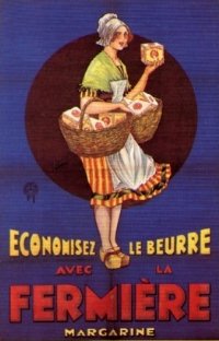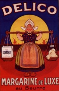 Pero un nuevo revés caería sobre la margarina en Estados Unidos porque en 1886 el Congreso imponía unos aranceles de dos centavos por libra de margarina, aunque las fábricas se instalan por el país y diecisiete estados fabricaron algo parecido a la margarina, burlando estas leyes, comenzando desde ese momento una guerra que dura hasta nuestros días, sobre todo por el colorante que debe de ponerse en el producto. La margarina era aceptada por su bajo precio pero no admitida en todos los hogares del mundo hasta que llegó en primer lugar la Primera Guerra Mundial, que encareció todos los productos relacionados con la cesta de la compra, hizo que su consumo ascendiera de forma significativa, sobre todo en Estados Unidos, pero todo fue como el canto del cisne, ya que en la década de los años 30 del pasado siglo las autoridades federales impusieron de nuevo impuestos a la margarina coloreada con aceite de palma y en 1932 se prohibió su uso en el ejercito y otras agencias federales. Pero la guerra aún no estaba perdida porque el gran salto de este producto llegó en primer lugar en Alemania en plena Segunda Guerra Mundial, ante la escasez de productos lácteos y desde entonces es imparable su ascenso, compitiendo en precio y calidad con la genuina mantequilla. Desde su invención la margarina experimentó muchos cambios en su composición, en la actualidad se puede hacer con una gran variedad de grasas animales y vegetales, incluso se han introducido en el mercado margarinas con fitoesteroles que reducen los niveles de colesterol, aunque aún persiste la discusión sobre la relación directa del consumo de margarinas y las enfermedades coronarias, para lo cual las empresas fabricantes han reducido notablemente las grasas trans, que se forman al hidrogenar los aceites vegetales hasta llevarlas a menos del 1% de la composición del producto, muy por debajo de las recomendaciones de la Organización Mundial de la Salud que aconsejan que debe de estar por debajo del 2%. Información básica obtenida de la enciclopedia Wikipedia. |
