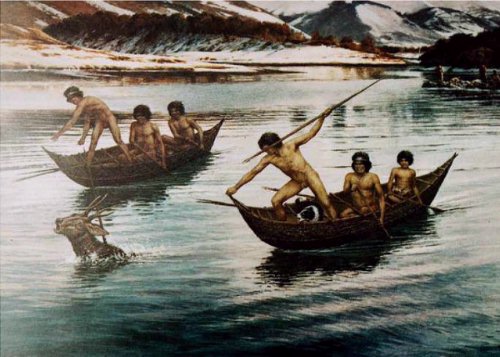 SU HABITAT Tomemos por unos minutos un mapa del sur chileno, para ubicar la zona delimitada entre los 47º y 55º de latitud sur, es decir, entre el Golfo de Penas y la cordillera Darwin de la Patagonia Occidental; ese era el hábitat de los indios Kawesqar o Alacalufes, un lugar delimitado entre la Cordillera de los Andes y el Océano Pacífico, formado por cientos de islas, canales y fiordos, con bosques impenetrables que se cubren cuando sube la marea y deja al desnudo grandes extensiones rocosas, cuando baja. Son pocos los lugares con bancos de arena de pendiente suave, y la anchura de los canales, no permite muchas veces, la navegación de embarcaciones medianas. Sin embargo, los Kawesqar tenían como único medio de movilidad, canoas construidas con corteza de árboles unidas firmemente con cuerdas de cuero de foca o lobo marino. Pero a esta accidentada geografía debemos añadir los intensos vientos provenientes del sur, frecuentes y severos aguaceros durante gran parte del año y temperaturas que oscilan entre los 9º y -4º. En ese contexto climático y geográfico era imposible el cultivo y crianza de animales, lo que justificaba su vida nómada como canoeros. El fuego era la única protección ante las bajas temperaturas, por lo que siempre iban con un tizón encendido desde la precaria choza que habitaban temporalmente hasta el interior de la canoa, que era su verdadero hogar. Los Kawesqar, solo se protegían con una capa hecha de piel de foca, atada con una cuerda al cuello, y muy rara vez, era de piel de zorro o huemul; en cambio la piel de nutria o de coipo, se empleaba para proteger a los pequeños hasta una determinada edad, aunque la mayor parte del día, estaban desnudos, tanto hombres como mujeres. Su vida giraba alrededor de la alimentación, para lo cual iban en busca de lo que la naturaleza circundante les podía ofrecer, que básicamente, era carne. Carne de pinnípedos, de cormorán, huemul, crustáceos, moluscos, ballena, ánsares, centolla, huevos de caiquen, y a veces, pescado. EN BUSCA DE ALIMENTOS Una mañana durante los primeros días de verano, Capitano, su mujer y su pequeña niña Frosh, se preparan para salir de caza. Desde muy temprano, “desayunan” con carne de lobo marino o cormorán de días anteriores, que despide un ligero tufillo a descomposición. Luego se disponen a cargar la canoa, con venablos, lanzas para capturar peces, arco, flechas y unas provisiones de mariscos y carne para ir saciando el hambre durante la jornada de caza; en el centro de la frágil embarcación acomodaban sobre un montículo de arena o grava, un tizón encendido, y acompañados de un perro, comienzan un largo recorrido por los canales de las interminables islas de la Patagonia Occidental. La mujer de Capitano, rema mientras él está atento a cualquier sonido que le permita ubicar a la futura presa. Solo el chapotear de los remos y el crepitar de las ramas encendidas, rompen el profundo silencio de estos intricados parajes. De pronto logra avistar en un roquedal una manada de lobos marinos con sus crías, y a una señal, su mujer maniobra la canoa hasta permitir que Capitano ponga pie en una roca. Los animales lo miran estúpidamente sin el menor asomo de peligro. El indio ha elegido su presa y avanza de frente hacia ella, y lo hace de esta manera, porque si lo hiciera por un costado, el lobo, al ser atacado, podría apoyarse sobre una de sus aletas, golpearlo, morderlo o huir. Pero no, Capitano avanza decidido, y ya frente a él, le asesta un terrible golpe en la cabeza que vuelve a repetir una y otra vez hasta que el animal cae muerto junto a su cría que ha corrido la misma suerte. Los otros lobos que han presenciado la escena emprenden una rápida retirada hacia el canal; entonces Capitano arroja con fuerza su arpón fabricado con hueso de ballena y lo clava en el cuerpo del más rezagado que logra tirarse al agua, pero detrás salta el perro de la canoa para hostigarlo, la mujer maniobra rápidamente de tal manera que el indio se suma a ella y van detrás del animal herido que se enreda entre los sargazos, esas masas flotantes de algas, que le impiden continuar su desesperada carrera. Y allí el indio, con toda su fuerza, le asesta varios mazazos hasta matarlo. Remolcado hasta un claro entre las rocas, y después de arrastrar al primero, y su cría, comienza la faena de destriparlos. De ellos aprovecharán su piel para la confección de capas y calzado, y su carne, que los alimentará por algunos días. Improvisada la choza donde han de refugiarse temporalmente, Frosch duerme envuelta en una capa de pieles de coipo, mientras Capitano y su mujer, cortan con el filo de una concha, tajadas de carne que tuestan sobre el rescoldo, producto de un nuevo tizón. La carne está poco hecha, y a lo ojos de los primeros navegantes que llegaron a tener contacto con los Kawesqar, dirán que estos salvajes comían carne cruda cuya sangre empapaba sus manos y les chorreaba a lo largo del cuello.