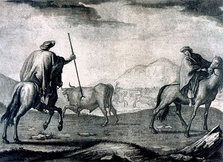 SIETE VACAS Y UN TORO Cuando en agosto de 1535 Carlos I de España autoriza el envío a las Indias de la más importante expedición al Río de la Plata, lo hace poniendo al frente de 16 naves, a Don Pedro de Mendoza con la orden de fundar por lo menos tres fortalezas para expandir el poderío español en esa parte del continente ante el avance de los portugueses. Sin embargo no es este adelantado quien introduce ganado vacuno a la zona pampeana, sino, Juan Núñez de Prado, que lo hará 13 años después trayendo desde Potosí, vacas y ovejas hacia Tucumán. Lo seguirá Francisco de Aguirre a través de la Cordillera de Los Andes en 1551 arreando ganado proveniente de Santiago, aunque el verdadero aumento de la población ganadera se debe al ganado proveniente del Paraguay en 1556 como consecuencia del apareamiento de un toro con siete vacas traídas por los hermanos Goes desde Brasil, según narra el primer historiador de los acontecimientos en el virreinato del Río de La Plata, Ruy Díaz de Guzmán en su libro La Argentina Manuscrita, de 1612: “ En este mismo tiempo llegaron por el río Paraná abajo cierta gente de la que estaba en el Brasil y con ella, el Capitán Salazar, y Ruy Díaz de Melgarejo, marido de Doña Elvira de Contreras, hija del capitán Becerra, como queda referido, y otros hidalgos portugueses y españoles como Scipion de Goes, Vicente Goes, hijos de un caballero de aquel reino llamado Luis Goes: estos fueron los primeros que trajeron vacas a esta provincia, haciéndolas caminar muchas leguas por tierra, y después por el río en balsas; eran siete vacas y un toro a cargo de un fulano Gaete, que llegó con ellas a la Asunción con grande trabajo y dificultad solo por el interés de una vaca, que le señaló por salario, de donde quedó en aquella tierra un proverbio que dice: son más caras que las vacas de Gaete.” A partir de ese momento podríamos decir que los hábitos alimenticios de los habitantes del Río de La Plata comienzan a cambiar muy lentamente y a lo largo de los años, irán reemplazando al choique (avestruz), al pecarí (jabalí), la vizcacha, el pato, la perdiz y codornices, por carne de vaca e incluso de caballo, que también habían encontrado en estas tierras un ámbito propicio para su reproducción después de ser abandonados por Domingo Martínez de Irala cuando huye de Buenos Aires asediado por los indios, el hambre y las enfermedades.