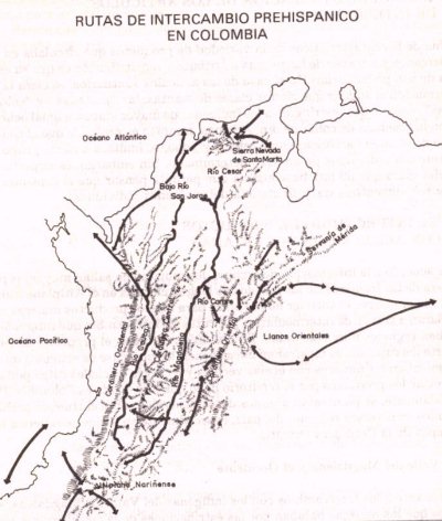 Los Mercados Una representación tangible del intercambio la vemos en los mercados, los mercados corroboraban esta economía de subsistencia con sobrantes para comerciar, estos sitios se convirtieron en el lugar de encuentro de las diferentes étnias que acudían para intercambiar o hacer trueque de unos productos por otros y así satisfacer sus debilidades en cuanto a aprovisionamiento. En estos mercados, que funcionaban en lugares y dias específicos se encontraban diversos elementos propios del clima y la tierra de origen. Existían también, los mercados especializados como era el de la sal, el de la coca y el de las mantas de algodón. Los nativos recorrían largos caminos para llegar a su destino y obtener el producto deseado. Para determinar “el precio” del intercambio se tenían en cuenta ciertas normas: - la calidad, esto se refería por ejemplo al mercado de las mantas, su valor crecía de acuerdo con el tamaño de la manta y el tipo de algodón usado, - el transporte, dependía de la distancia que tenía que recorrer para conseguir el producto, es el caso de la sal, en los lugares donde abundaba la sal se conseguía más barata que en otros sitios lejanos. - la oferta y la demanda, se refiere a comestibles o productos que se traían desde muy lejos pero que su consumo no era popular, se puede decir que se trataba de artículos exóticos. No se ha podido determinar el volumen de estos intercambios, sin embargo la presencia de estos centros de mercado, como ya se mencionó, refleja la confluencia de los nativos a ciertos sitios a negociar su mercancía, no obstante se cree que era pequeño, pues existían ciertos impedimentos para una fluidez de dichas plazas. La falta de moneda era uno de ellos, ya que, para efectuar el trueque debía haber un interés mutuo entre los productos en cuestión, lo cual no siempre se daba. Nuevamente el transporte era un inconveniente, ya que, por un lado, no contaban con bestias para llevar una considerable cantidad de productos de un lugar a otro, por tanto lo máximo que se podía llevar era una carga y con eso cambiar lo equivalente, y por otro lado los trechos variaban, cuando eran cerca no había problema pero si se trataba de un pueblo a varios kilómetros de distancia se necesitaban dos o tres dias para llegar caminando, lo que lleva a pensar que tuvieran rutas y caminos más cortos para llegar a sus destinos. Repasando a los cronistas, se encuentran algunas frases alusivas a este tema: “una carretera que tendrá como cien leguas de longitud, muy ancho y con sus valladeras” (Piedrahita); “desde él muchos caminos y cortos para poder entrar en los llanos” (Simón) “Un caminillo angosto de indios donde están incadas unas piedras” (Ibarra)[2], aunque los trabajos arqueológicos no evidencian la existencia de estas trochas. Según lo que indican los documentos del Archivo, los muiscas no se alejaban mucho de su territorio, se suplían con intermediarios para hacer llegar sus manufacturas a otros cacicazgos y étnias a través de rutas “comerciales”: - con el occidente los Muiscas se proveían de oro y algodón, bajando por la cordillera occidental, lo cambiaban por “textiles, cerámicas, tubérculos de altura y sal”.[3] Debido a la situación del territorio Muisca, cerca de las cordilleras (Oriental, central y occidental) permitía a los indígenas desplazarse relativamente fácil y relacionarse con otras étnias, donde el trueque de productos alimenticios era habitual. - El río Magdalena y otros, funcionaron como un medio de comunicación eficiente y fueron la vía hacia el norte y oriente . - Por el lado Oriental estaban los Llanos donde se encontraron restos de productos muiscas, igualmente en el altiplano se conseguían, según los documentos, comestibles como la miel, el pescado, el maíz y aves así como artefactos para comer como el totumo. - Por el sur no se ha encontrado mucha información. - La ruta de la sal puede ser consultada en nuestra página. Se puede concluir que los mercados con su consiguiente intercambio, jugaron un papel importante en la economía indígena, donde no sólo se trocaban productos comestibles sino otra clase de géneros en su mayoría suntuarios para realizar sus ritos y prácticas religiosas. Los nativos tenían una economía autosuficiente por su adecuado uso de la tierra, su cuidado con el ecosistema y su aprovechamiento de las posibilidades que les brindaban los recursos naturales, por consiguiente esta actividad era para afianzar lazos con sus vecinos más que para sobrevivir. |