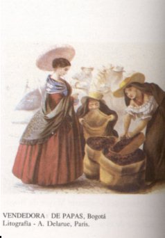 Huevos, cabuya, plátanos, zarazas, El señor Holton (1857), de origen americano, se inspira en el mercado que colocaban en la plaza Mayor y escribe el anterior verso, a su vez nos ilustra esta escena con las siguientes palabras: “hoy viernes salgamos y miremos qué cosas traen los campesinos: a la izquierda están los puestos de artículos indígenas hechos en lana, algodón y de la fibra de pita... hacia el centro de la plaza se encuentran las ventas de azúcar y sal, a la derecha raíces comestibles y legumbres, gallinas en jaulas parecidas a las que usan nuestros pescadores de anguilas, huevos envueltos de dos en dos y pescados. Al lado un niño desnudo, un pavo y un marrano amarrado de una pata a una estaca y más adelante los vendedores de frutas hasta el pie del altozano. Volvemos hacia el sur y nos encontramos con los vendedores de zarazas y de telas importadas. También hay una o dos tiendas o más bien cajones con techo (donde venden oro en polvo). En seguida hay rollos de estera de 5 pulgadas de ancho y los que la venden también la cosen sentados en el suelo. En la esquina sur están las ventas de carne y bajando al occidente pasamos entre las carnicerías y los graneros, hasta que al llegar al frente de la casa de los Portales encontramos puestos donde venden sogas y toda clase de artículos de madera, algodón y lana que ya habíamos visto al entrar a la plaza.” ( pp236) Parece que la distribución era muy sistemática, y se agrupaban por amistad o por región, al terminar el día se retiraban los puestos y cada uno cogía para su casa, dejando la plaza llena de desperdicios y basura, que era recogida, al otro día, por los presos vigilados por dos soldados, los gallinazos no se quedaban atrás y venían por su alimento contribuyendo así al aseo. Al hablar de las frutas es interesante revisar el posible origen de algunas de ellas, donde, de paso, verificaremos el mestizaje que, para esta época, ya se había dado. El libro de Clara Inés Olaya, “Frutas de América” nos sirve de ayuda para este tema, ella dice que la naranja llegó a América en los viajes de Colón, quien transportaba las plantas o las semillas para sembrarlas en las islas del Caribe, aunque su origen es del sur de China; a la piña se refiere como la llamada fruta exquisita, su verdadero nombre es Ananas, cuando llegó Colón a las islas del Caribe, los indígenas se la ofrecieron como gesto de bienvenida y debido a su parecido con una bellota del pino europeo, los españoles la bautizaron piña sin respetar el nombre original, situación muy frecuente en la conquista. La granadilla de las selvas americanas es registrada por los cronistas como unas frutas que colgaban de los bejucos, por su redondez, sus negras y dulces pepas y su interior afelpado la compararon con la granada traída de España. El mango fue introducido por los portugueses a Brasil en 1700 procedente de la India mientras que la chirimoya proviene de los barrancos y laderas pedregosas de los Andes, la llamaron “la obra maestra de la naturaleza”. El melón fue confundido por los españoles con la calabaza, pronto se dieron cuenta de su error y mandaron traer sus semillas de Europa y Africa para su cultivo, su origen es Egipto. En Centro América y en general en América se disfrutaba desde siempre el aguacate, la papaya, el anón, la guayaba, el cacao, el lulo, la uchuva, el zapote, el níspero, el marañón, el chontaduro, el mamoncillo, la piñuela, el icaco, la ciruela, el madroño y la guama que sin duda hoy en día son conocidos en otras tierras. Para el Conde de Mollien, francés que nos visitó en 1823, el mercado que se reúne todos los viernes en la Plaza del Palacio no es del todo desagradable a pesar del desorden, en este mercado se ven carnes, granos, verduras, frutas de toda clase europeas y americanas tales como fresas, piñas, aguacates, y melocotones, también hay yucas, zanahorias, patatas y plátanos, maíz, cebada y trigo, almendras de cacao y pilones de azúcar. Registra además un puesto de plantas de los páramos y otro de flores como claveles, rosas y jazmines. Le Moyne, también de Francia, quien vivió en Colombia entre 1828 y 1839 nos da un punto de vista diferente al referirse al famoso mercado de la plaza mayor: “Todos los viernes se celebra en esta plaza el mercado principal y a el van por la mañana tanto las damas de la alta clase social como las pertenecientes a las demás, las primeras acompañadas de una criada o de un indio que lleva a la espalda un gran canasto donde se van poniendo las provisiones que se compran para toda la semana. Esos días y siempre a la misma hora se congregan en la escalinata de la catedral una multitud de curiosos o de hombres a caza de caras bonitas; desde lo alto de esas gradas la vista domina todo ese enjambre de vendedores, compradores o desocupados, conjunto de gentes del campo y de la ciudad de toda clase y condición color y pelaje... entre los artículos de que está abundantemente provisto el mercado figuran, al lado de los productos tropicales provenientes de tierras calientes, casi todas las legumbres de Europa que suministra la Sabana de Bogotá. ( Le Moyne, pp 132)