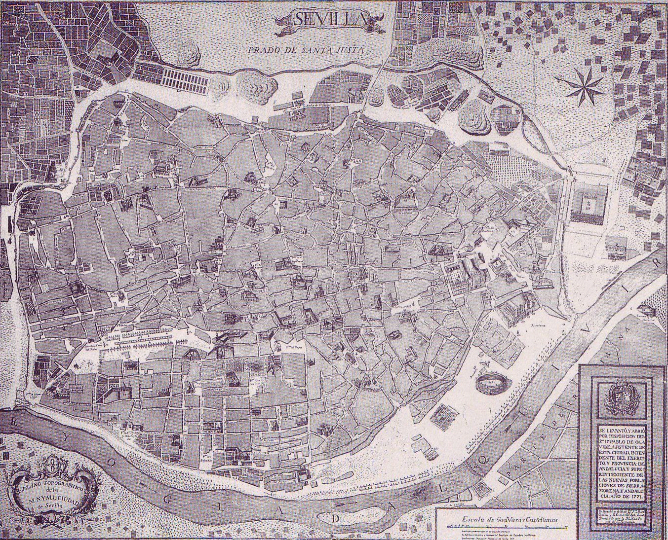 Milagros y visiones apocalípticas.- El día 3 de julio ocurrió un hecho singular que no me resigno a transcribir: "Se vio prodigio grande en el cielo, cual nunca se había visto, y fue que el Sol estuvo desde las doce del día hasta las cuatro de la tarde tan carmesí, que parecía estaba bañado en sangre, sin que esto lo pudiera causar eclipse alguno, ni otra influencia de astro. Todos los atribuyeron a la demostración de la justicia divina, tan merecidas por nuestras culpas...". Se dieron casos de supervivencia difíciles de explicar, como la de dos niños que vivían en lo que hoy es el cortijo de Tercia de la familia Benjumea, en San Jerónimo, donde todos murieron excepto ellos, según se narra eran de corta edad, los cuales estaban afectados también por la peste pero que sanaron "sin más cura que la del cielo, ni más abrigo que la copa de un naranjo, ni más cama que el duro suelo". Otro niño de tan sólo 3 años sustentó a un hermano que estaba en la cuna durante 4 días alimentándolo sólo con pan que mascaba y que le ponía en su boca, en la misma habitación donde sus padres yacían muertos, la suerte quiso que los vecinos derribaran la puerta, ya que el olor era insoportable por la descomposición de los cuerpos, y los encontraran. El licenciado Juan Velázquez, que administraba los Sacramentos en el hospital de San Miguel de Convalecientes, un día "saliendo a la plaza del Hospital de la Sangre, oyó llorar a una criatura, buscóla entre los muchos colchones y ropa que allí se arrojaban, y desenvolviendo una estera de eneas, la halló arrimada a los pechos del cadáver de su madre. Cogió al niño en los brazos el piadoso cura y dándolo a criar vive hoy para mayor prodigio". Otro caso casi similar es el de "otro niño de pecho, muerta su madre procuraba el sustento de ellos, y saliendo a veces arrastrando a la puerta de su casa, y viéndole los que pasaban por ella sólo le daban algo ignorando la muerte de su madre: volvía el niño al sustento de los pechos de la que le parió, y de este modo lo sustentó algunos días, hasta que el olor dio a entender el espectáculo tan miserable: y así mismo vive hoy el niño para más admiración". El último caso a contar, entre los muchos que ocurrieron, fue lo que le pasó a Antonio Venegas de Cordova, Caballero de la Orden de Santiago, hombre ya mayor y con achaques que llevaba una noche un carro con ocho cuerpos para enterrarlos. Estando a las diez de la noche en la puerta de la parroquia de San Andrés comenzó a oír quejidos y "sin más ayuda que la de su valor y caridad, fue apartando los muertos, y tomando entre los brazos al enfermo (que juzgando estaba muerto lo habían arrojado en aquel lugar) le envolvió en su capa, y llamando a la iglesia le entró en ella, y cuidó de su vida regalándole con dulces, y no se apartó de él hasta el que al amanecer murió". Los estigmas de la enfermedad crean una nueva moda.- Todos aquellos que padecieron la enfermedad, y habían sobrevivido, se quedaron calvos, algo que no arredró a las gentes de Sevilla, donde tanto mujeres como hombres, a salir así a las calles, sin intentar disimular las secuelas de la enfermedad, quizá como consecuencia del desánimo y abatimiento de los supervivientes de la tragedia que habían perdido todo menos sus vidas. "Andan hoy hombres y mujeres sin solicitar disimulo para el mayor desaliño. Plegue a Dios mejoren muchos de pensamientos con la falta de vanidad del cabello". La peste se presentó en tres de sus variantes: Landres, Carbunclo y Tabardillo y hubo enfermos que padecieron las tres a la vez. Interesante resulta leer sobre la quema de ropa: "Lo precioso de las holandas, lienzos delicados, telas, colgaduras, oro, plata, sedas, y otras alhajas de homenaje de casa, fue cosa indecible, y que valía una India". La quema de las ropas, donde entre sus costuras se escondían las pulgas, junto a la purificación de las casas con hogueras hechas con maderas y hierbas aromáticas como son el ciprés, laurel o romero hicieron más habitable una ciudad que era toda un cementerio y olía a muerte, a la vez que saneándola. Los alimentos en una ciudad que moría.- Al principio de la epidemia la falta de abastecimiento de la ciudad fue muy notable, ya que había miedo por parte de los hortelanos de traer alimentos y contraer la peste y por la riada que se padecía, que hacía muy difícil el transitar por los caminos, tanto es así que perecieron mucha gente por no tener víveres, "este azote de hambre fue en aumento, que casi se midió con el estado del mal, pues llegó a valer un huevo (cosa increíble) doce cuartos y cuatro reales de a ocho de plata una gallina". Hubo personas sólo encargadas de procurar abastecer a la ciudad, y sobre todo a los hospitales y conventos, de alimentos, como fue el caso de Alberto Pardo Calderón, Caballero de la Orden de Calatrava y Oidor de la Real Audiencia, el cual estuvo en una venta a tres leguas de Sevilla comerciando, con indecibles sacrificios, con los dueños de las fincas para abastecer la ciudad de "gallinas, pollos, huevos, pichones, carneros y pan amasado", consiguiendo con su acción abaratar un poco los precios. También, entre otros estuvo el licenciado Diego Trujillo que buscó alimentos de forma incansable desde la venta de Peromingo, que hoy forma parte de la ciudad. Tampoco hay que olvidar los donativos en especies que se hacían o el celo que existía para que los alimentos estuvieran sanos en los hospitales, donde la despensa y la cocina estaba fuera de las salas y que se daba por medio de un torno, como el de los conventos de clausura. Epílogo de una epidemia y prólogo de la miseria.- Con Sevilla en ruinas por el abandono de gran parte de sus casas, de los campos desiertos sin nadie que los cultivara y sin casi mano de obra se hacía muy difícil el subsistir y sobre el hambre que padecían se apoderó de todos aún más hambre, para desesperación de los supervivientes. En los archivos de 