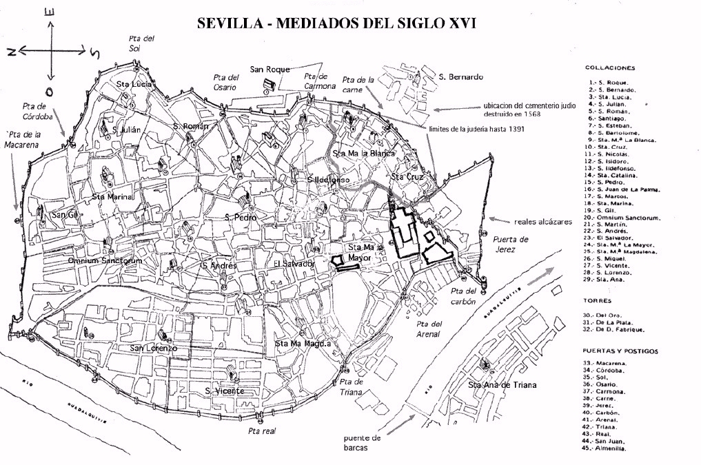 Cuando todo estaba perdido se desató la locura.- Al quedar saturado el hospital de la Sangre, uno de los más grandes del mundo entonces, la Junta Real decretó que se formasen otros dos en Triana, en la parte que miraba al Monasterio de la Cartuja; uno para enfermería y otro para convalecencia, siendo el encargado de su gobierno el Fiscal de la Real Audiencia, Francisco Vizcarrero. Los cirujanos, sin saber la forma de atajar la enfermedad se limitaban a sajar los bubones con resultados contradictorios, unos morían y otros sobrevivían sin saber la causa. Se dictaron órdenes de la Junta por medio de pregoneros donde se ordenaba, a todos los vecinos de la ciudad, que matasen a todos los perros y gatos "por llevar estos el contagio de unas a otras partes", llegando a ser tal la cantidad de animales sacrificados que para desocupar las calles de sus cadáveres fue necesario destinar un carro. Se hicieron ayunos, azotes, rogativas y procesiones, siendo una, la del barrio de San Lorenzo, tan tumultuosa que se estimó en más de diez mil los feligreses, aunque no fue ésta la única, ya que "por así en esto como en todo, obtenga siempre el primer lugar la grandísima y devotísima Procesión que algunas noches hicieron los señores Prebendados con el restante Clero de la santa Iglesia; la cual estando a puerta cerrada, resplandecía tan hermosa toda rodeada de hachas y faroles, que retrataba el Templo que miró Isaías, retocado de la Gloria de Dios, o ya a fin propia en la noche de Navidad. Tenía cinco Estaciones..." Los gastos del personal, la alimentación y toda la infraestructura que existía se paliaba en parte por las donaciones de los que todavía estaban sanos, lo cuales ayudaban con regalos de gallinas, carneros, bizcochos y serones de pasas "en tiempo que no se hallaba en Sevilla una" y "Para que se admirase más la cordial piedad de los habitantes de esta Nobilísima Ciudad cierto día se juntó en la Iglesia de San Antonio de Padua una copiosa multitud de gente principal, y llevando cada uno en las manos una fuente y canastos de regalos diferentes, fuéronse en procesión hasta la Sangre cantando Letanías". Según el que informa en el libro, todos los días aparecían doscientos y otras trescientos cuerpos abandonados a su suerte en las gradas de la catedral, al igual que en la iglesia del Salvador y en menor cantidad en las de las otras iglesias. El olor a muerte era insoportable en toda Sevilla, tanto que se hizo cerrar todos los templos, trasladando el Santísimo Sacramento a un vecino Monasterio, ordenando las autoridades crear seis nuevos grandes cementerios que se situaron en en el alto de Colón, fuera de la Puerta Real; en la Almenilla, fuera de la Puerta de la Barqueta; fuera de la Puerta de la Macarena; fuera de la Puerta de Triana, a un lado del Convento de Nuestra Señora del Pópulo (del que pude ver los restos cuando se construyó un bloque de viviendas y donde había una lápida en mármol que indicaba el lugar exacto de los enterramientos); fuera de la Puerta Osario; en San Sebastián, más allá de la Puerta de Jerez, a todo esto había que añadir las fosas o carneros que se hicieron en el hospital de la Sangre. Había tantos muertos que algunos que estaban en las calles o en sus propios domicilios permanecían varios días sin enterrar. Tanto cadáver y el miedo al contagio, así como la falta de enterradores y carros hizo más macabra la visión de la ciudad al llevar a los muertos arrastrando, atados unos tras otros, hasta los cementerios. Esta terrorífica visión hizo que un sevillano sintiéndose enfermo por la peste "por no exponer su cuerpo después de muerto a tan terrible desventura, cargose como pudo de su pobre cama, fuese con ella a un cementerio, y bajando a un carnero abierto, compuso su camilla donde le pareció menos horrible el espacio y reconfortándose en ella, entre la compañía de cadáveres se enterró en vida, por no verse arrastrado en muerte". Cuenta nuestro narrador que estando un enfermo con el frenesí se levantó de la cama "y a un niño de dos años hijo suyo, cogiéndole de los pies le estrelló los sesos contra la pared". Otro que salió de su casa en camisa, como estaba en la cama, atravesó la ciudad y se arrojó al río y se ahogó. Un tal Manuel Rodrígues, portugués natural de Oporto, afectado por 3 landres y 18 carbunclos, en el delirio de la fiebre se soltó de las ataduras que le habían puesto para que no se moviera y una noche se subió a lo alto del tejado del hospital para tirarse, cayendo en una de las fosas abierta y llenas de muertos "donde estuvo día y medio entre más de ocho mil difuntos" no llegando a morir, ya que tras la epidemia se contaba entre los supervivientes, ejerciendo el oficio de sastre. Otro caso fue el de una esclava de un tal Francisco Venegas, la que, sintiéndose con la enfermedad, una mañana se fue al pie de una cruz que existía fuera de la Puerta de la Carne y allí se desnudó de medio cuerpo, miró fijamente el crucifijo, se clavo unas cañas en los labios mientras con una piedra de pedernal se golpeaba el pecho en señal de pedir perdón, hasta que murió desangrada al dia siguiente.