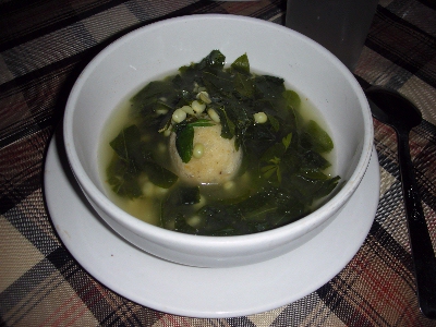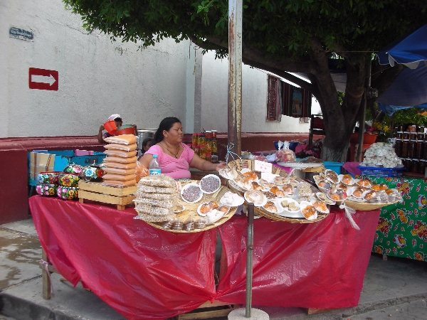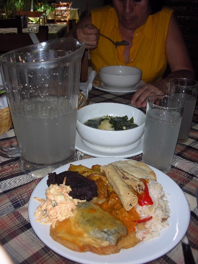La sopa de yerbitas de chipilín con bolitas de masa de maíz la tomé en Chiapa de Corzo y es exquisita. Además hice una “selección de platillos, sin orden ni concierto” estupenda que incluyó pollo en mole, arroz, chile mira pa’rriba, llamado así por lo picoso, empanada de pollo, taquitos de carne de res, ensalada de zanahoria, frijoles, chiles rellenos de atún, rebanadas de plátanos machos fritos, y tasajo con pepitas en una exquisita salsa hecha con jitomate, cebolla, pepitas de calabaza y chile. El tasajo es una carne suave secada con sal y cortada en trozos. Todo esto fue acompañado de una excelente agua de limón con chía. Para cerrar con broche de oro disfruté de unos deliciosos dulces: chimbo (pan de yema de huevo batido), muégano (hecho con huevo, harina y azúcar), putzinu (maíz tostado como palomitas), Suspiro de monja (preparado con yuca), curtidos de nanche y jocote (mezclados con ron o brandy y panela).