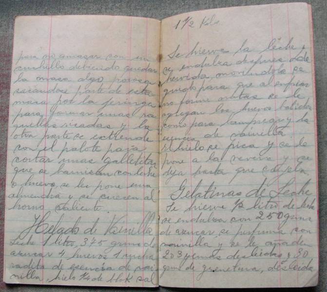 “Sobre la tabla de amasar se cierne la harina, se hace la fuente y se colocan las yemas, las grasas, el azúcar, la vainilla y 2/3 partes de la leche. Se revuelve sin incorporar harina a que no se sienta el grano del azúcar, se empasta con la harina para no amasar con un cuchillo debiendo quedar la masa algo porosa sacándose parte de esta masa por la jeringa para formar unas rosquillas risadas y la otra parte se extiende con el palote para cortar unas galletitas que se barnizan con leche o huevo, se les pone una almendra y se cuecen al horno caliente". Helado de Vainilla