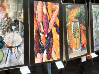 El maíz sirve para hacer también obras de arte como los portales de las Iglesias y los arcos que se levantan, se hacen bellos mosaicos con los granos y se combinan con frijoles de colores, todo un espectáculo de creatividad. El maíz se baila en danzas que recuerdan el tiempo de rogativas por la siembra, por la la lluvia o por la cosecha. El maíz se escucha en las canciones, las pirekuas púrhépechas, que celebran a este producto de la tierra. El maíz se goza en las imágenes que cotidianamente nos recuerdan que este es uno de los mejores regalos que los antiguos dioses, Curicaveri, la divinidad púrhépecha del fuego y creador universal de las cosas, y Cueraváperi, la diosa tierra, madre naturaleza[4], dieron a los hombres de estas tierras.