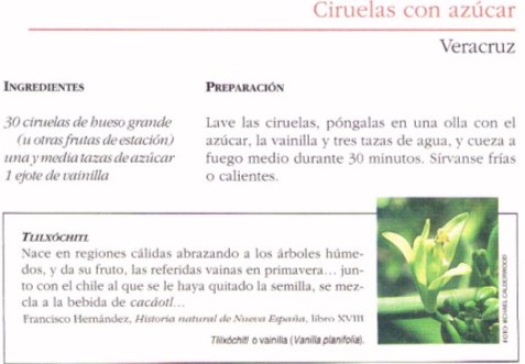 Saborizante natural de vainilla.[14] Flor y vainas de vainilla[15] [1] Foto de tarjeta postal de familia Delfín Guillaumin. [2] Foto de la autora, julio de 2010. [3]http://www.google.com.mx/imgres?imgurl=http://2.bp.blogspot.com/_ux0hxKTNcNc Fecha de consulta 3 de abril de 2011. [4]Cristina Barros y Marco Buenrostro, Cocina prehispánica. Continuidad cultural. Recetario, Edición especial de Arqueología Mexicana, N° 12, INAH-Editorial Raíces, Noviembre de 2002, p. 19. [5] Cristina Barros y Marco Buenrostro, La cocina prehispánica y colonial, México, Conaculta, 2001, p. 35. [6] Xavier Lozoya, La herbolaria en México, México, Conaculta, 1999, p. 18. [7] Citado por Cristina Barros y Marco Buenrostro, Ibid., p. 23. [8] Ibid., p. 23. [9] Guido Gómez de Silva, Breve Diccionario Etimológico de la Lengua Española, México, COLMEX-FCE, 1999, p. 708. [10] Rémi Siméon, Diccionario de la Lengua Nahuatl o Mexicana, México, Siglo XXI, 1984, p. 708. [11]http://heliopolisblog.wordpress.com/2010/11/12/la-gastronomia-a-traves-de-la-historia-%E2%80%93-america-prehispanica-xi/ Fecha de consulta 3 de abril de 2011. [12]http://portal.veracruz.gob.mx/pls/portal/docs/PAGE/CEJM/ARCHIVOSPDFS/PAPANTLAPDF/GASTRONOMIA.PDF Fecha de consulta 3 de abril de 2011. [13] Recetario familia Delfín Guillaumin. Foto de la autora. [14] Foto de la autora. [15]http://tertuliasculinarias.blogspot.com/2011/02/vainilla-dulce-aromatica-eterna-como-el.html Fecha de consulta 3 de abril de 2011.