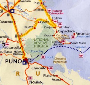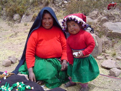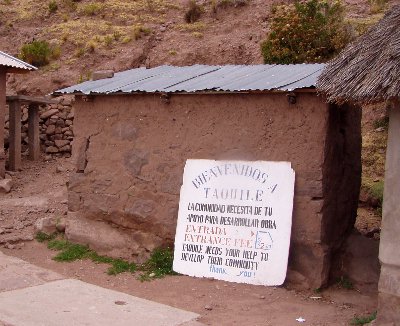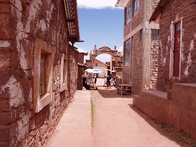 Tras tres horas de viaje por este mar interior a 3.800 metros sobre el nivel del mar se llega al embarcadero de la isla que es una gran montaña que emerge de entre las aguas como un coloso con una altura máxima de 250 metros. La ascensión se hace penosa por lo empinado de su camino pese a la calzada escalonada de piedra que fue colocada por la comunidad indígena en el año 2004, y por la altitud que hace difícil la respiración, haciéndose necesaria sucesivas paradas para tomar aliento, momento que es aprovechado por una multitud de niños que intentan sacar unos soles (moneda oficial de Perú) a cambio de dejarse fotografiar junto a los turistas. Según se va ascendiendo el paisaje es impresionante, en los días despejados se llega a divisar la otra orilla del lago Titicaca y las tierras que pertenecen a Bolivia, y se pueden observar las terrazas labradas en la roca en donde, en sus bancales, se siembra de forma rotatoria el preciado alimento que a duras penas sustenta a una población que ronda los 3.000 habitantes, unas 350 familias. En lo más alto se encuentra el poblado, sus habitantes de habla quechua, vestigio de la expansión Inca en territorio Aymara, forman una comunidad que se autorregula tanto en los aspectos políticos, sociales y económicos con escasa influencia estatal. |
