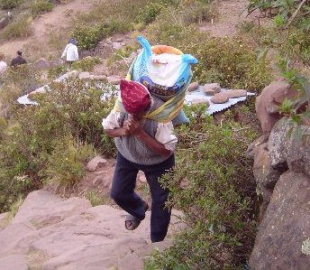 Es en 1961 cuando la Junta Militar nacionalista de la época decide rescatar y relanzar los usos y las costumbres nativas, dentro de la crisis de identidad que todavía sufre el país, y es entonces cuando toma carta de naturaleza el destino turístico de la isla, que tras muchos avatares se hace realidad, a duras penas, tres lustros después, relanzándose de forma definitiva en abril de 1979 con el nombre de “Taquile puertas abiertas al turismo mundial” haciendo su presentación oficial en el Reino Unido en 1985, Estados Unidos en 1991, Francia en 1993, etc. En la actualidad subsiste gracias al turismo ecológico, no muy numeroso (sobre 40.000 visitas anuales), y de la economía de subsistencia que se obtiene de la pachamama o de la madre tierra, siendo un pueblo eminentemente vegetariano, cultivando principalmente papa, maíz pequeño, olluco, habas, cebada, trigo y quinua, aunque existen en la isla gallinas, cerdos y cuyes (conejos andinos) que se sacrifican en las grandes solemnidades, así como bovinos (yo pude contar menos de una docena de ellos que se utilizan para las labores de labranza), así como productos de la pesca representada básicamente por el pejerrey y la trucha, especies no autóctonas que están esquilmando las otras del lago Titicaca. El resto de los alimentos deben de ser traídos a la isla desde Puno, como son la sal, azúcar y coca entre otros productos, y que son subidos en fardos a espaldas de los habitantes de la isla en un peregrinar lastimoso. |