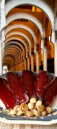 Costumbres de mesa Aclarado este punto, hay que apuntar que la cultura sefardí no es ningún recuerdo, sino una realidad absolutamente en vigor, con sus tradiciones, ritos y por supuesto cocina, de cuyo recetario da buena cuenta la doctora Ester Benbassa, profesora de la Universidad de París III, quien en su libro “Cocina judeo-española” afirma: “Cada familia judeo-española tiene su propio libro de cocina”. La etnóloga Joëlle Bahloul aseguraba que la cocina judeo-española del Imperio Otomano fue la más característica y completa del conjunto de las culturas mediterráneas, y testimoniaba la multiplicidad de intercambios mercantiles que se produjeron en nuestra región durante aquellos siglos. Una curiosa muestra de este esplendor lo cuenta Jean Christophe Attias, poniendo como ejemplo la conversión de un plato turco, los Köftes de pollo, una especie de bolas de pollo amasadas con leche, queso y mantequilla (auténtica herejía condenada a muerte en el Levítico por mezclar carne y leche), pero verdadera delicia gastronómica que los sefardíes veían comer con envidia a sus vecinos cristianos y musulmanes, y que las cocineras judeo-españolas adaptaron a su religión haciendo las Albóndigas de Gayna (gallina). En la cocina hebrea las tradiciones se mantienen celosamente mediante el Kashrut, un conjunto de leyes que estipulan qué alimentos son Kasher (adecuados) o Parve (neutros) y cómo deben consumirse. Estas leyes son interpretaciones más o menos exageradas del Levítico y de la propia Torá, por ejemplo la prohibición levítica de cocinar la carne del cordero en la leche de su madre se desarrolló en la religión judía hasta el extremo de que en una misma comida no se podía ingerir ningún tipo de carne con ninguna leche ni derivado de ésta. En la tradición hebrea actual, incluso se dispone de dos vajillas y cuberterías diferentes para que, según sea la comida de carne o de leche, en ningún plato se sirvan los dos productos antagónicos, aunque no sea simultáneamente. Aún hay más, con la llegada de los frigoríficos, en cada casa que respete el Talmud, debe haber dos neveras, una para la carne y otra para los productos lácteos y, en caso de no disponer de ambas, hay que elegir de antemano qué uso se le da, ya que si entra carne nunca podrá hacerlo el queso, la leche o la mantequilla. Y el colmo es que los restaurantes kasher (los que respetan la religión) tienen ¡dos cocinas independientes!, una para manipular los productos lácteos llamada ‘Halavi’ y otra para las carnes que se nombra ‘Bassari’. Del mismo modo, al no coincidir la descripción de los mariscos como peces con escamas, su consumo está prohibido. La mesa sefardí se abre con un variado surtido de entremeses, el mezé, que se suelen tomar con ‘raki’, una especie de aguardiente anisado parecido al ‘pastis’, que reconforta maravillosamente el estómago. Incluso en la farmacopea doméstica se usa para aliviar lo que llaman males de la boka del korason, y que son desde el dolor de muelas hasta la aerofagia, pasando por la gastritis, úlceras y demás enfermedades relacionadas con el aparato digestivo. Esta especie de aperitivo se toma en casa cuando hay alguna celebración religiosa o familiar, también se puede hacer fuera, en algún bar donde se reúnen los amigos y de algún modo dejan ya casi solucionada la comida. Los platos más habituales suelen ser los fritos de calabaza y berenjena, las ‘filikas’ o especie de empanadillas rellenas de varios quesos, huevos y especias; el ‘djadjik’, que es como una sopa de yogur con pepino y menta aliñado con aceite de oliva y vinagre; la ‘tarama’, pasta preparada con huevas de pescado secas, miga de pan, cebolla cruda y aliño de limón y aceite; los ‘vahtes’ o ‘garato’, que son pescados azules salados y conservados en aceite como nuestras anchoas; la ‘tuna’, escabeche de bonito preparado con limón en vez de vinagre; el ‘plaki de avas’, un estofado de habichuelas blancas que se come frío revuelto con una ensalada de hortalizas y un sinfín de ensaladas de remolacha, berenjenas, calabacines, col, coliflor, escarola, achicoria, judías verdes, habas, pepino, rábanos, pepinillos, sesos, etc. Creo innecesario hacer ningún comentario sobre la maravillosa costumbre que aún permanece en España de celebrar el aperitivo, rito que suele convertirse, en algunos días festivos, en verdadero sustituto de la comida, y que yo personalmente no perdono ni aún estando en otro país. Otra costumbre sefardí que se respetaba hasta hace apenas dos o tres décadas en España, era la de comer pescado los viernes, una deformación sincrética del ayuno cuaresmal y la preparación del Sabath, que dio como resultado un interminable recetario en el que se puede disfrutar de preparaciones basadas en los métodos antiguos de conservación: ahumados, salmueras, salazones, escabeches, encurtidos, en aceite, etc., ya que por aquel entonces el pescado fresco no llegaba en condiciones a la meseta. Respetado el ayuno sabatino, todos los miembros de la familia esperaban impacientes el retorno de los hombres de la sinagoga para poder desayunar. Era otra fiesta que se repetía cada semana y que da idea del valor que la mesa tiene en esta cultura. En esta ocasión el aperitivo era más contundente ya que se compone de kozas d'orno, o sea de preparaciones mucho más sofisticadas que se cuecen lentamente en el horno. Estas llamadas kosas d’ orno, suelen ser las ‘borrekas’, empanadillas tiernas rellenas de queso que se cuecen al horno suave; el pastel o pastela, que es un hojaldre relleno de verduras, queso, o carne, y espolvoreado de azúcar glasé; el ‘almodrote’, pastel de berenjenas con queso y huevo que se asa al horno y una vez frío y cuajado, se corta en grandes dados y las ‘filas’, o ‘filikas’ citadas anteriormente. Durante el Pesah, es decir la Pascua, en las preparaciones que llevan miga de pan, como el almodr