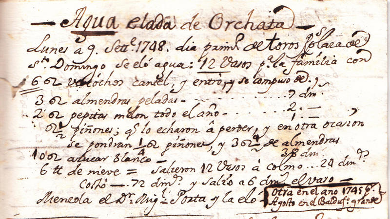 1.2.2.1 Trascripción del texto.- - Agua helada de horchata- Lunes a 9 de septiembre de 1748, dia principal de toros reales plaza de Santo Domingo. Se heló agua, 12 vasos para la familia con 6 onzas bizcochos cantel (?) y entró y se compuso de: 3 onzas almendras peladas ………………………………… …………7 dineros 2 onzas pepitas melón todo el año……………………………………. 2 dineros ………………… 1dinero ½ onza piñones; que lo echaron a perder, y en otra ocasión se pondrán ¼ de onza piñones, y 3 onzas y 1/2 de almendras, 10 onzas azúcar blanco….38 dineros 6 tt de nieve = salieron 12 vasos a colmo……………………….…….24 dineros Costó 72 dineros y salió a 6 dineros el vaso. Meneola el Dr Miguel Porta y la heló. En recuadro aparte: Otra en el año 1745 por agosto en el Baldufario grande. 1.2.2.2.Comentarios.- Independientemente de conocer la fórmula de la horchata como se hacía en el siglo XVIII, que hemos recreado y probado, se aprecia que era una bebida refrescante para momentos solemnes y grandes fiestas, más quizá por lo complicado de su elaboración que por el precio resultante del producto, aunque no era barata por cierto, como se puede comprobar, por ejemplo, en la lista de gastos con motivo de la celebración de la coronación de Carlos IV en Guatemala en 1789 o como bebida refrescante y especial que se tomaba en la Corte española en el reinado de Carlos III en 1729. La costumbre de tomar horchata la exportaron los colonos españoles a toda Sudamérica donde se bebe, en la actualidad, hecha con pepitas de melón o de arroz, pero no de chufa (ver bibliografía). Hay que hacer una observación: Justo al final del escrito, y en la anotación independiente, de la ingesta en el mes de agosto de 1745 de horchata en el Baldufario grande, en donde, de ser cierta esta interpretación, nos da la pista de que el anónimo que escribe el libro de cuentas podría ser notario o escribano en la ciudad, ya que es cierto que en Valencia, al menos desde el año 1735, éstos escribanos ponía a disposición de todo aquel que estuviera interesado en saber sobre escrituras antiguas o herencias el índice de éstas y donde se cobraba un real de vellón por año de antigüedad consultado. 1.2.2.3 Sobre la moneda.-