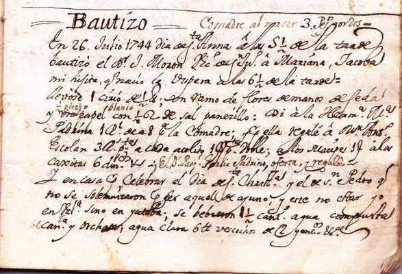 1.2.1.1 Trascripción del texto.- BAUTIZO- Comadre al nacer 3 pesos gordos. En 26 de julio de 1744 dia de Santa Ana a las 5 y ½ de la tarde bautizó el Dr. J. Morón (presbítero) de San Julián a Mariana, Jacoba mi hijita que nació la víspera a las 6 y ½ de la tarde. Llevose un cirio de ½ []; un ramo de flores de manos de seda y un papel con ½ [] de sal panecillo, di a la hermana [] padrina un real de a 8 para la comadre, y por ella regalé a don Antonio Escolar 3 reales [] a cada acólito, 1 [] doble; a los monjes 1[], a las cajitas 6 dms[], el Dr [] Garcia padrino oferta(¿) y regalo. Y en casa por celebrar el dia de Santa Cristina(¿) y el de San Pedro que no se solemnizaron y ser igual de ayuno y este no estar yo en Valencia sino en Yatoba; se bebieron 1 ½ cantara agua compuesta de canela y horchata, agua clara, 6 tt bizcochos de dos géneros []. 1.2.1.2 Comentarios.- Para saber como se hacía el agua de canela hemos recurrido al libro 'Arte de repostería' de Juan de la Mata, edición de 1786, donde dice: "Métase en una vasija de barro media azumbre de agua, dividida en pequeños trozos; y puesto todo a hervir, bien cubierta la vasija, a mediano fuego, hasta que haya dado tres o cuatro hervores, se aparta de él, poniéndolo sobre ceniza por espacio de cinco o seis horas, más o menos; hecho esto, y habiendo tomado el agua el sabor y el color de la canela, se verterá en una cazuela, aumentada del azúcar que se juzgare conveniente, para que la bebida quede agradablemente suave: pongo por ejemplo, para media azumbre de agua cinco o seis onzas de azúcar. Si estuviese la infusión con demasiado gusto de canela, se aumentará con agua fresca: conclúyase con colarla por la manga y helarla del propio modo que las demás". En lo referente a la elaboración de la horchata podemos comprobar que poco difiere con la que se elaboró en el libro de cuentas, ya que su fórmula es: "Tomáranse cuatro onzas de pipas de melón, dos onzas de las de almendras dulces, bien mondadas; puesto todo en el mortero, se molerá muy bien, rociándolo de cuando en cuando para que no reciban aceite de un poco de agua: bien molido, se destemplará en tres cuartillos de agua, pasándolo después por una servilleta para que se oprima. Esto ejecutado se aumentará la leche, un poco de torneadura sutil de limón y seis onzas de azúcar, dejándolo en infusión el tiempo suficiente para que perciba la sustancia el sabor a limón, y se deslíe el azúcar, colado por la servilleta, oprimiéndola bien, se echará en la garapiñera a helar". También Juan de la Mata da otra forma de hacer horchata, que denomina 'Orchata muy puesta en uso' y que se hacía así: "Se tomará un cuarterón de pipas de melón , calabaza y sandía, con su cáscara, y otro tanto de almendras dulces mondadas, moliéndolo todo en el mortero, y rociándolo con agua hasta cosa de media azumbre: después se colara por una servilleta, oprimiéndola bien: y añadido de cinco onzas de azúcar, y una cascarita de limón, naranja verde, se volverá a pasar por la servilleta, habiendo estado antes en infusión media hora para helar la horchata". Es posible que se pregunte como se podían helar en aquella época los refrescos si no existían los congeladores, ni las máquinas de producir frío; Juan de la Mata nos alecciona como hacerlo, debiendo aclarar que ya en el Siglo de Oro se traían nieves de los montes cercanos a lomos de burros, encerradas en cajas de madera forradas de zinc, que se almacenaban en depósitos subterráneos. "La común práctica en cuanto a las vasijas para helar bebidas y frutas, es la de los cubos, con sus garapiñeras de estaño (aunque en muchas partes son de cobre estañadas, o garrafas de vidrio con su corchera); pero proporcionadas a la cantidad de bebida que se hubiere de ejecutar, para lo que se deberá tener de todo género de garapiñeras, grandes, pequeñas y medianas, con sus cucharas para sacar y echar las bebidas, y de metal para trabajarlas.Ha de superar el cubo a la garapiñera, que ha de tener su tapadera del mismo metal, seis dedos; y en el ámbito tendrá de hueco un dedo, poco más, para poder introducir la nieve por debajo, arriba, y por todos lados; nunca se llena del todo la vasija; y si tiene cuello, poco antes de llegar a él; la nieve que corresponde a cada cuartillo de bebida [0,5 litros], es una libra [460 g], y un puñado de sal. Se echará la nieve y sal todo molido, y revuelto con ella, porque es el que congela las bebidas; hecho esto, a causa de que pueda evacuar el agua de la nieve, deberá tener la frasquera o cubo un agujerito por donde salga el agua, cuando se conozca perjudicial, meneándolas para que se hielen; habiendo descubierto las garapiñeras, se quebrantará aquel primer hielo que se nota, meneando la bebida por los costados de la garapiñera para despegar el hielo alrededor, y encima, para que por todos lados se hiele y trabaje; esto ejecutado, un cuarto de hora antes de servir las bebidas se registrarán de nuevo, reconociéndolas para ver si están bien trabadas del hielo; si no se volverán a aumentar de nieve y sal, del modo dicho. En estando en su debida proporción, se sacarán las bebidas en vasos, que se irán colocando en la salvilla: la azúcar que corresponde a cada cuartillo de bebida regular, son tres onzas, si no se quiere muy dulce, y un limón pequeño, con su cáscara picada, y zumo o agrio". En un libro propiedad de la Biblioteca Nacional que lleva por título 'Tratado completo de cocina, pastelería, repostería y bollería', editado en Madrid en 1875 por la librería de Anllo y Rodríguez y cuyo autor es anónimo, nos dice sobre la horchata: "Helado de horchata. Se mondan cuatro onzas de pepitas de melón y dos onzas de almendras dulces y se muelen juntamente en un mortero, rodándolas de cuando en cuando con un poco de agua, y se cuela todo con expresión por una servilleta; se le echan seis onzas de azúcar y un poco de cáscara rallada de limón, deján